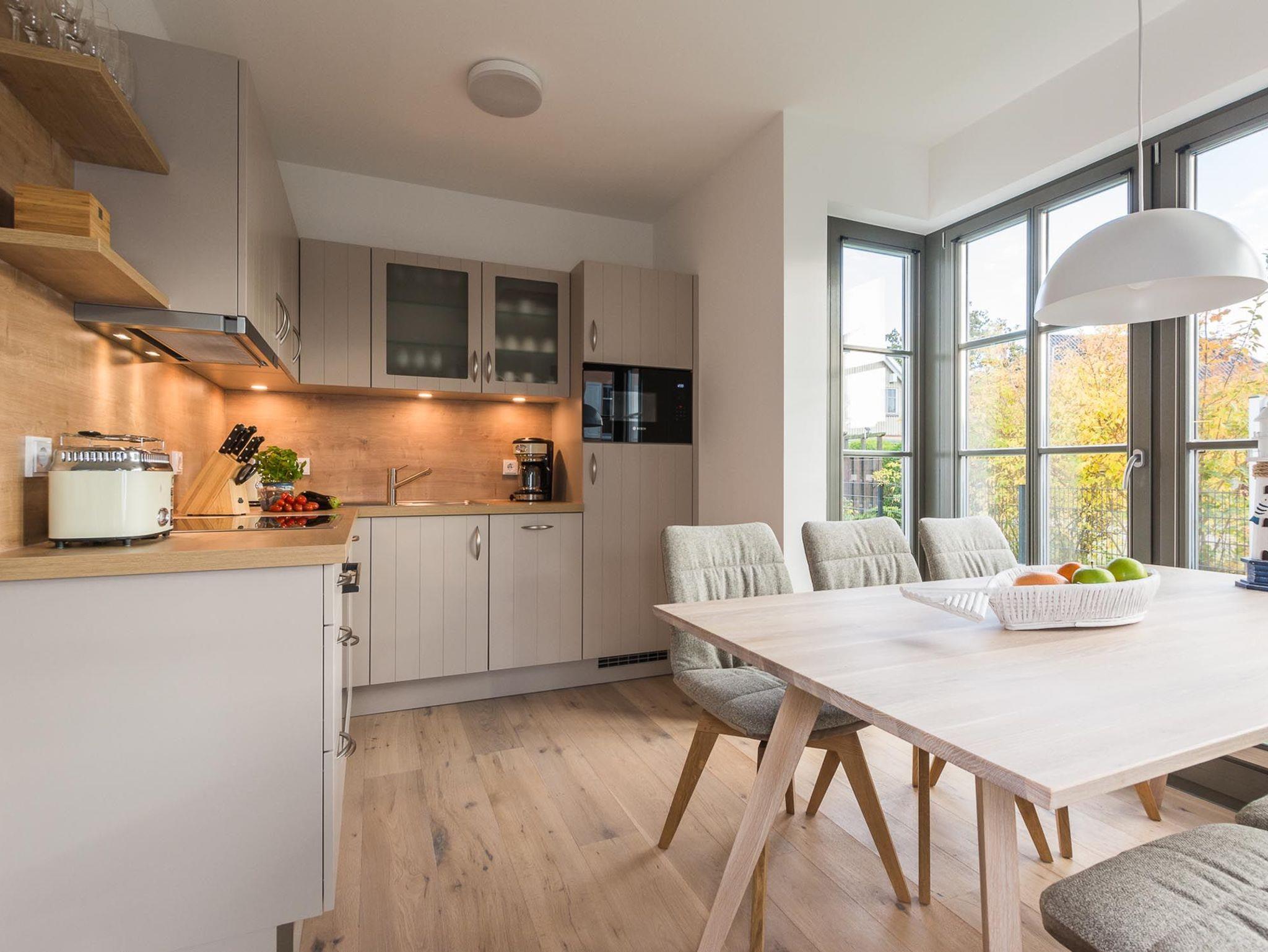 Im Erdgeschoss befindet sich ein heller und komfortabler Wohnbereich mit offener Küche und gemütlichem Essbereich. Die Küche ist voll ausgestattet und lässt keine Wünsche offen.