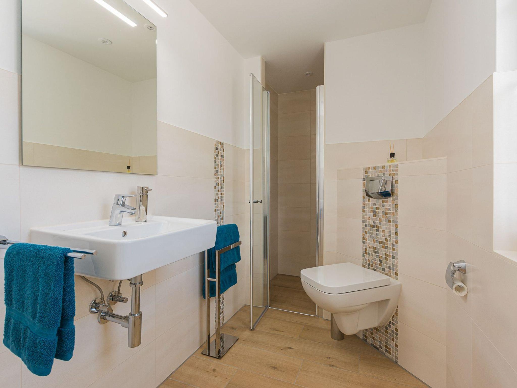 • Zwei Badezimmer: beide mit ebenerdigen Duschen, eines zusätzlich mit Badewanne
