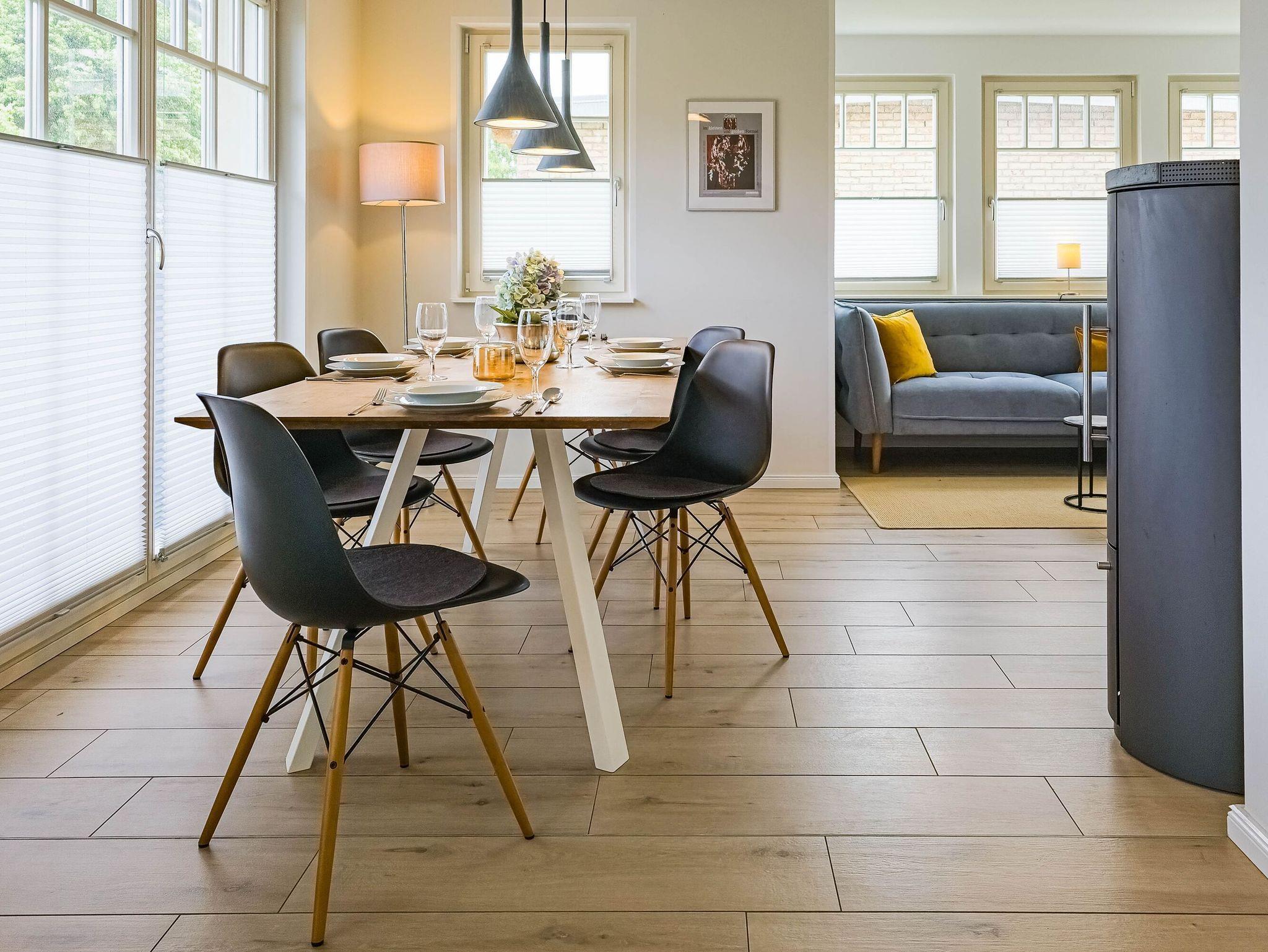 Das Ferienhaus Kranschehus empfängt Sie mit einer warmen und einladenden Atmosphäre. Der großzügige Wohnbereich mit Kaminofen ist das Herz des Hauses und lädt zu entspannten Abenden ein sei es bei einem guten Buch oder einem gemeinsamen Spieleabend. Die moderne Küche ist vollständig ausgestattet, sodass Sie mühelos köstliche Mahlzeiten für Ihre Liebsten zubereiten können.