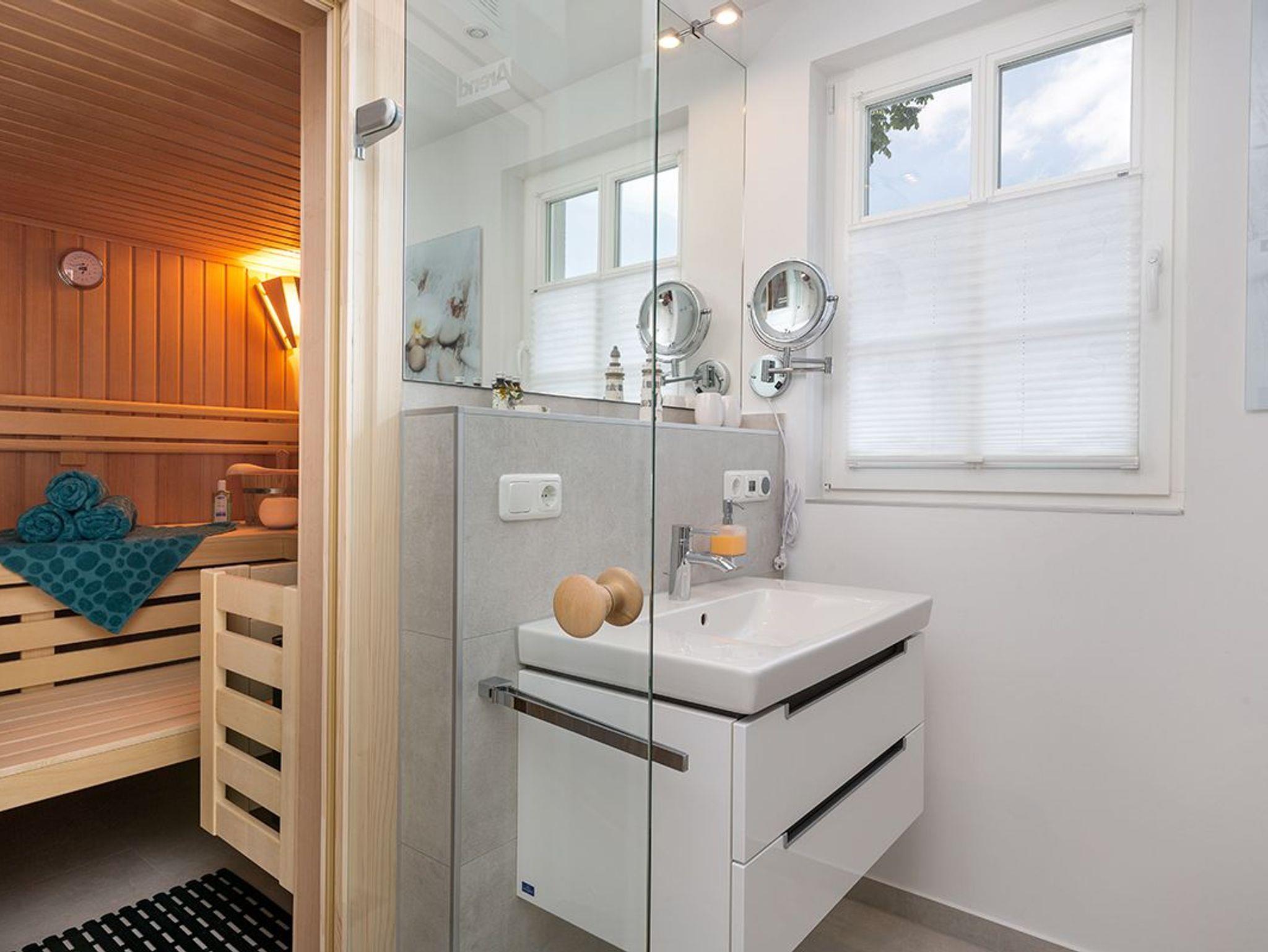 • Badezimmer: Zwei moderne Bäder ? eines mit Whirlpoolbadewanne und Dusche, das andere mit ebenerdiger Regendusche und großzügiger Sauna