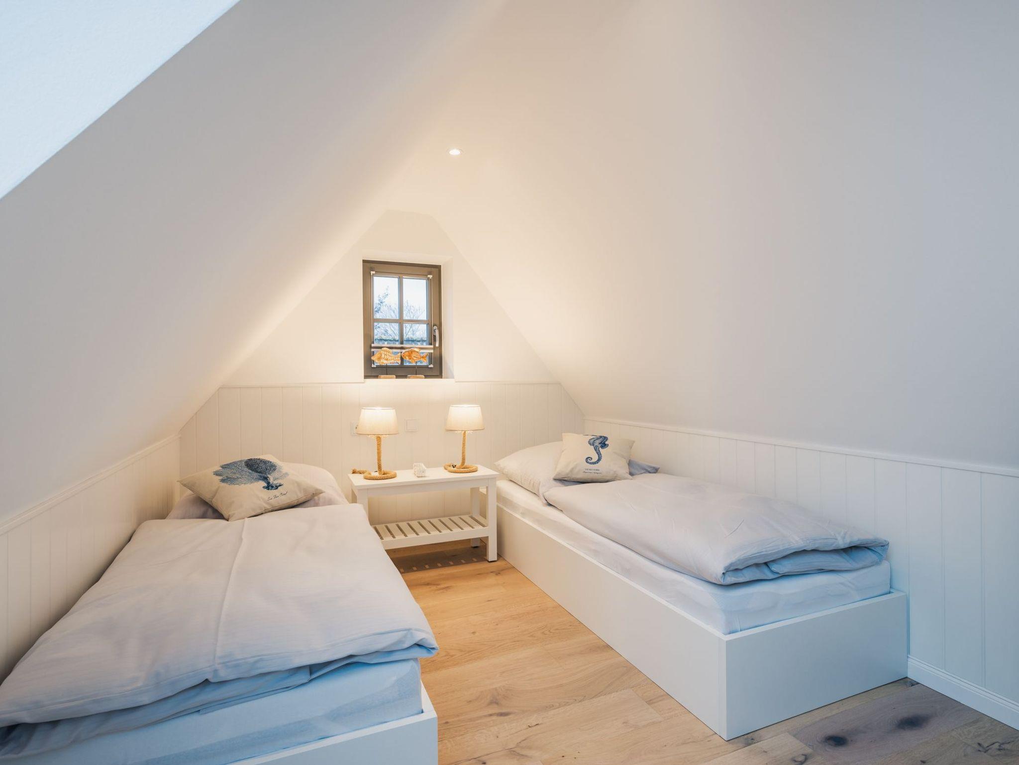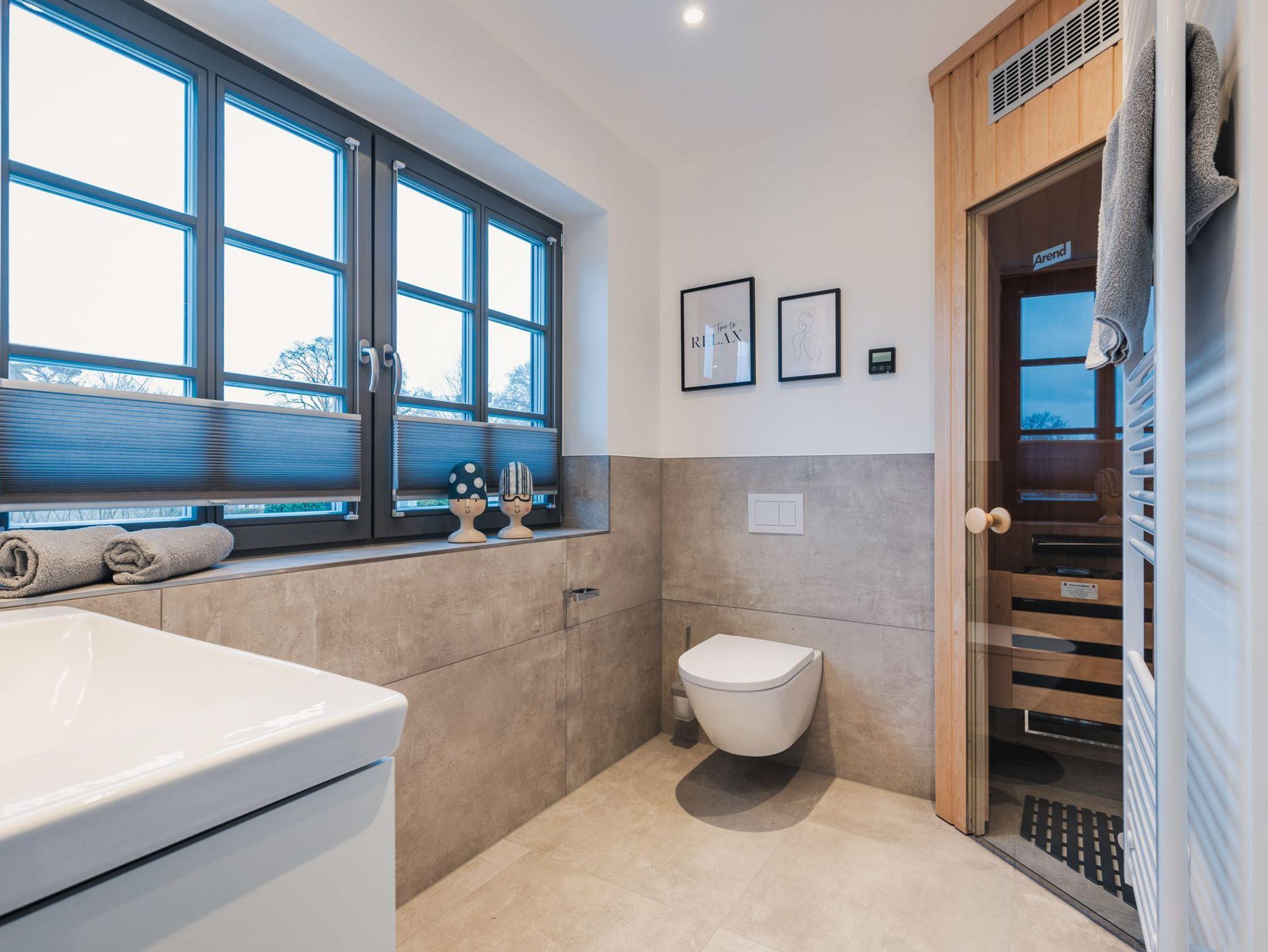 Das Ferienhaus verfügt über zwei moderne Badezimmer, die beide mit geräumigen Duschen und hochwertigen Armaturen ausgestattet sind. Das Hauptbadezimmer bietet zusätzlich eine entspannende Sauna, in der Sie die Wärme genießen und neue Energie tanken können.