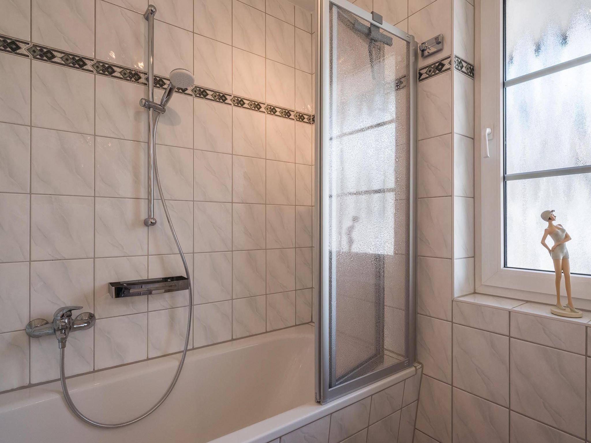 Das Badezimmer befindet sich ebenfalls im Erdgeschoss und ist mit einer Dusche in der Wanne ausgestattet. Das WC befindet sich im selben Raum.