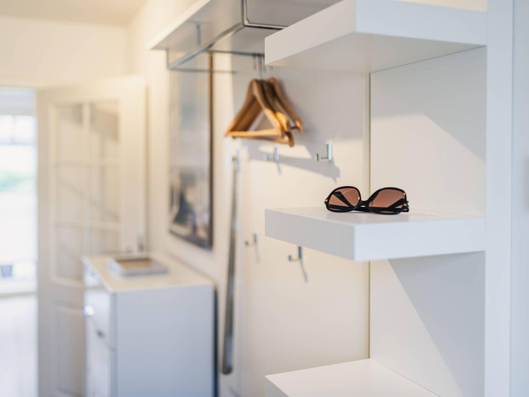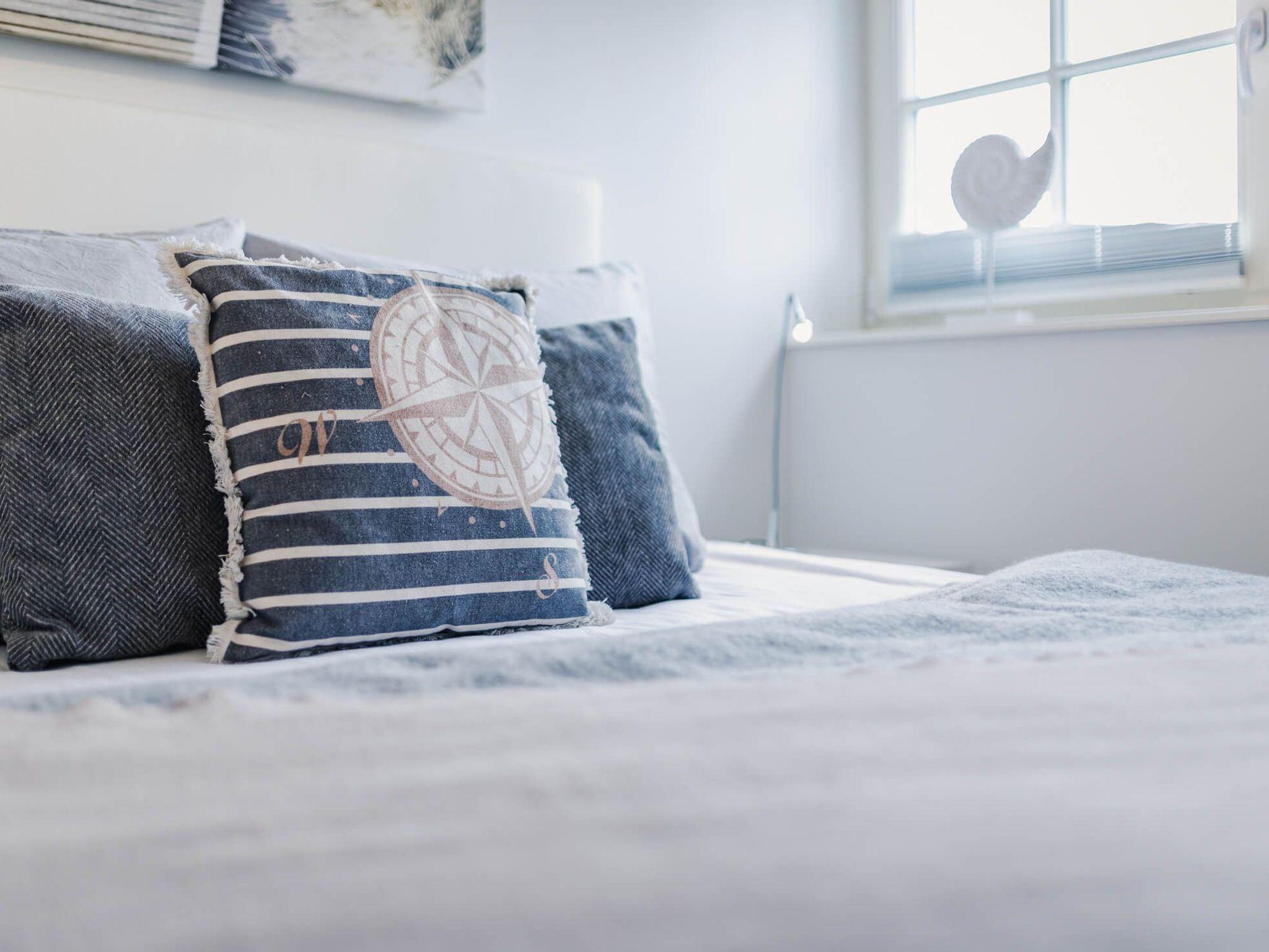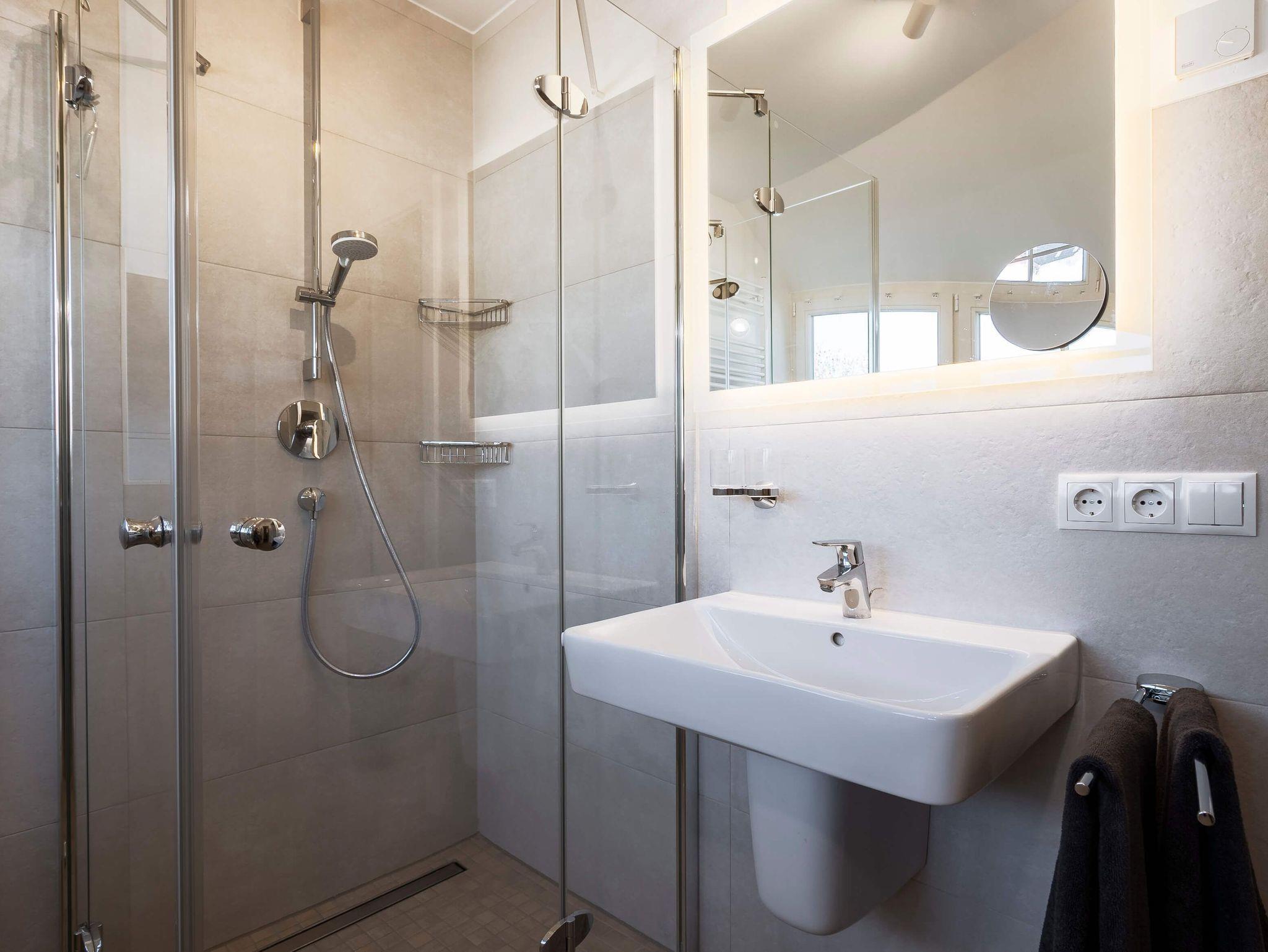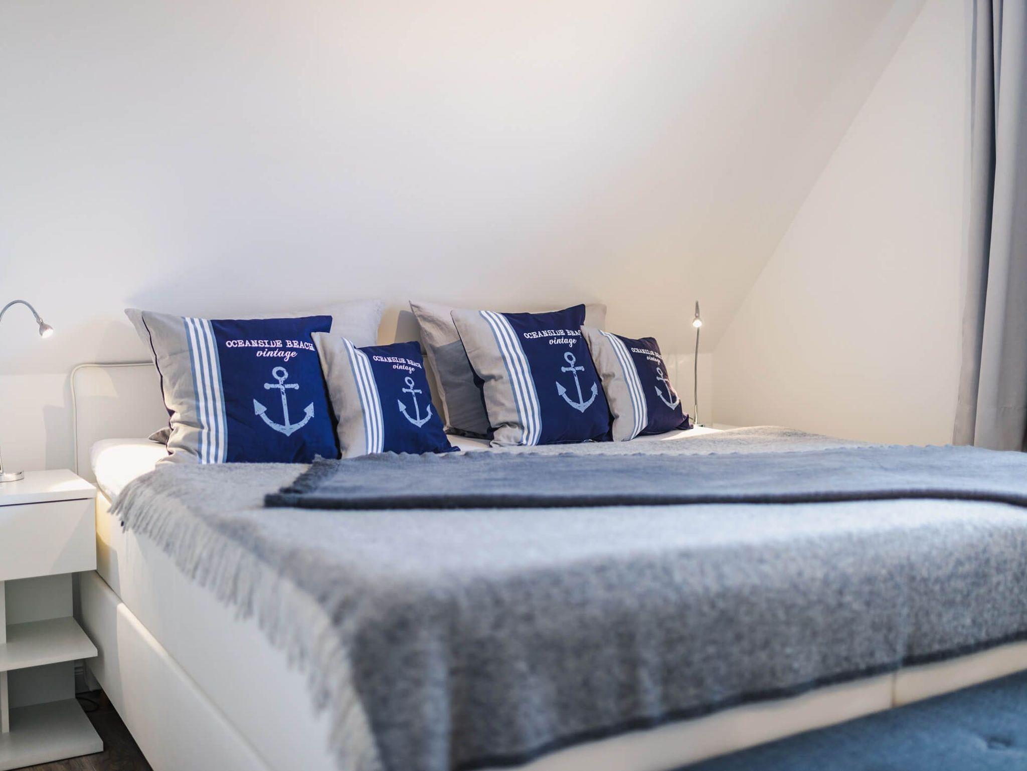 Im Obergeschoss befinden sich zwei Schlafzimmer für je zwei Personen. Die Schlafzimmer, sind mit Boxspringbetten, Kleiderschränken und Ablagemöglichkeiten ausgestattet. Ein Schlafzimmer verfügt zusätzlich über einen Flatscreen TV. In dieser Etage befindet sich das voll ausgestattete Badezimmer mit beleuchtetem Spiegel, bodengleicher Dusche, Badewanne und finnischer Sauna.
