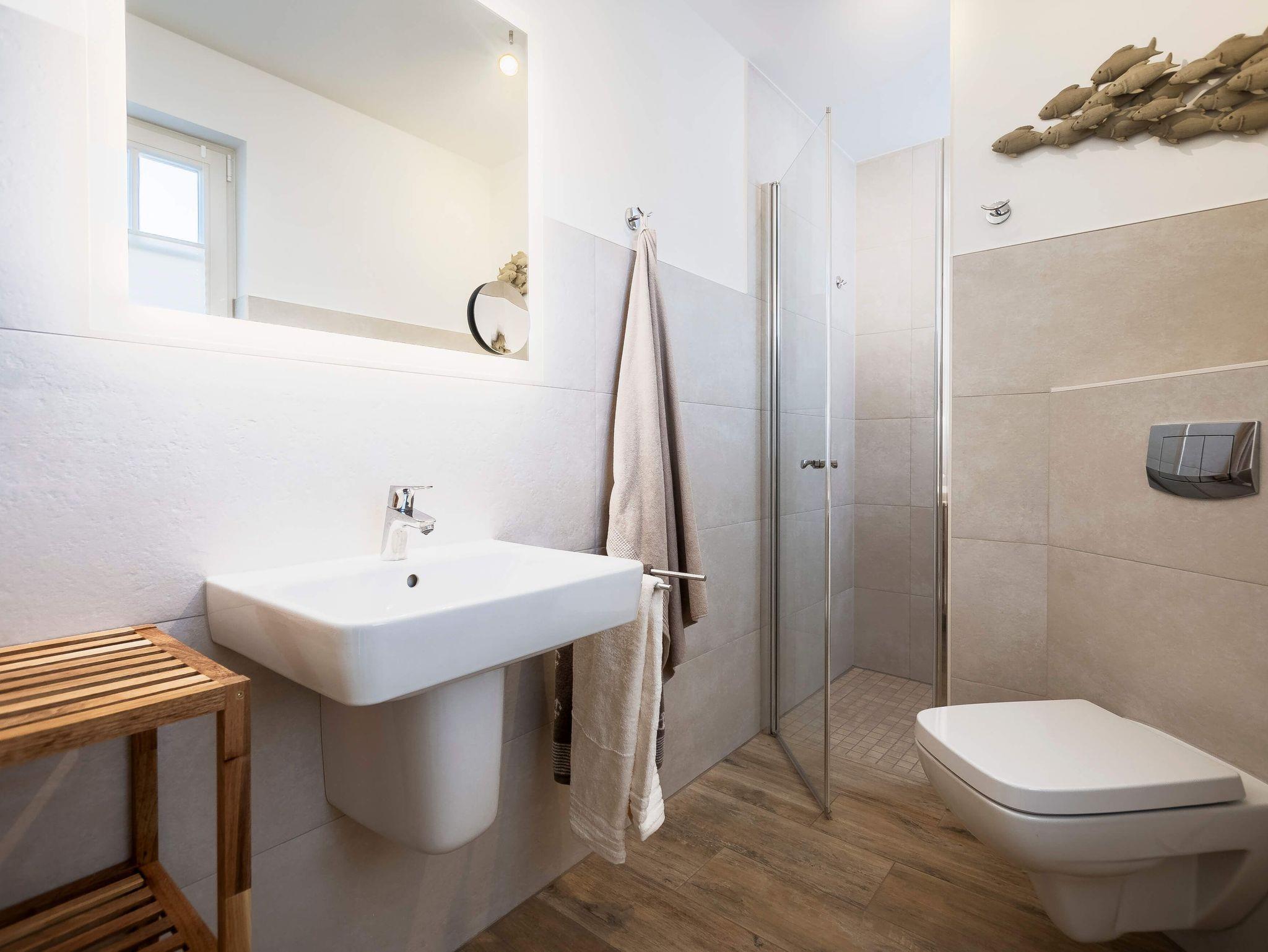 Das Erdgeschoss des Hauses besticht durch ein modernes Wohnflair mit klaren Linien. Im Flur erwarten Sie ein großer Garderobenbereich und ausreichend Abstellmöglichkeiten. Einladende bodentiefe Fenster im Wohn- und Essbereich sowie eine angrenzende Südterrasse mit Terrassenmöbeln, Sonnenschirm und zwei großen Sonnenliegen sind großzügig gestaltet und farblich abgestimmt. Die offene, vollständig ausgestattete Einbauküche mit modernen Elektrogeräten bietet vollen Urlaubskomfort. Im Wohnzimmer befinden sich eine große, bequeme Sitzlandschaft aus Leder sowie ein Kaminofen für gemütlich Stunden. Bücher und Gesellschaftsspiele stehen zur Verfügung. Ein geräumiges Badezimmer mit WC, großzügiger Dusche und beleuchtetem Spiegel runden den Komfort im Erdgeschoss ab.