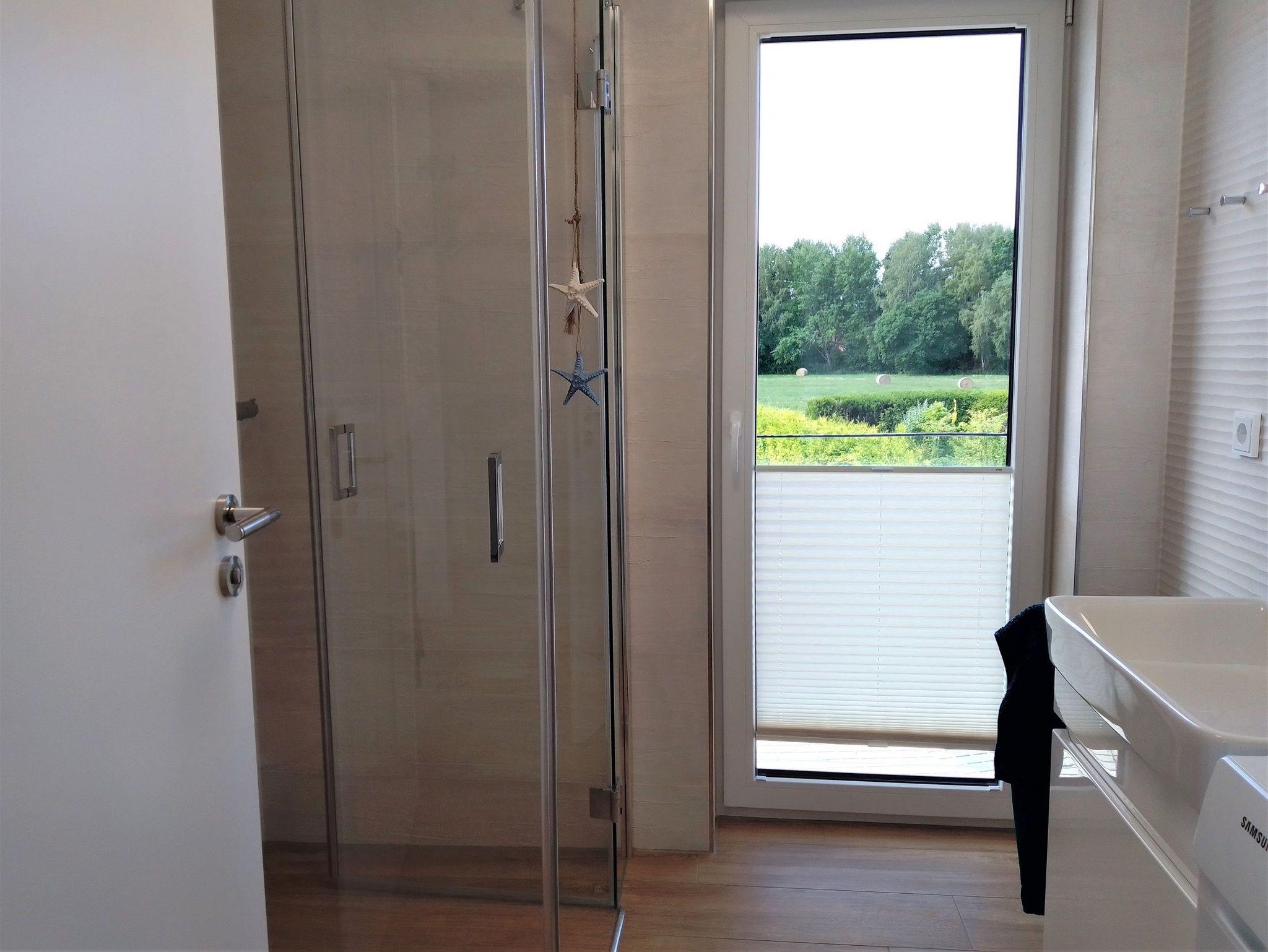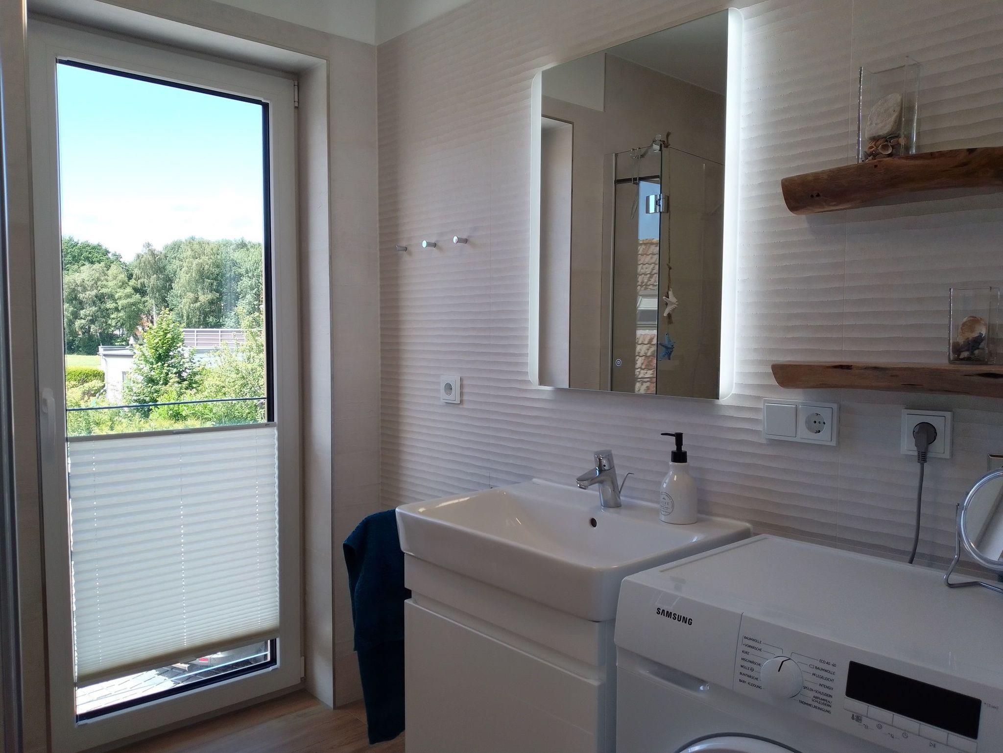 Das Bad besticht durch sein Wohlfühlambiente und ist mit einer ebenerdigen Dusche und einer Waschmaschine ausgestattet.