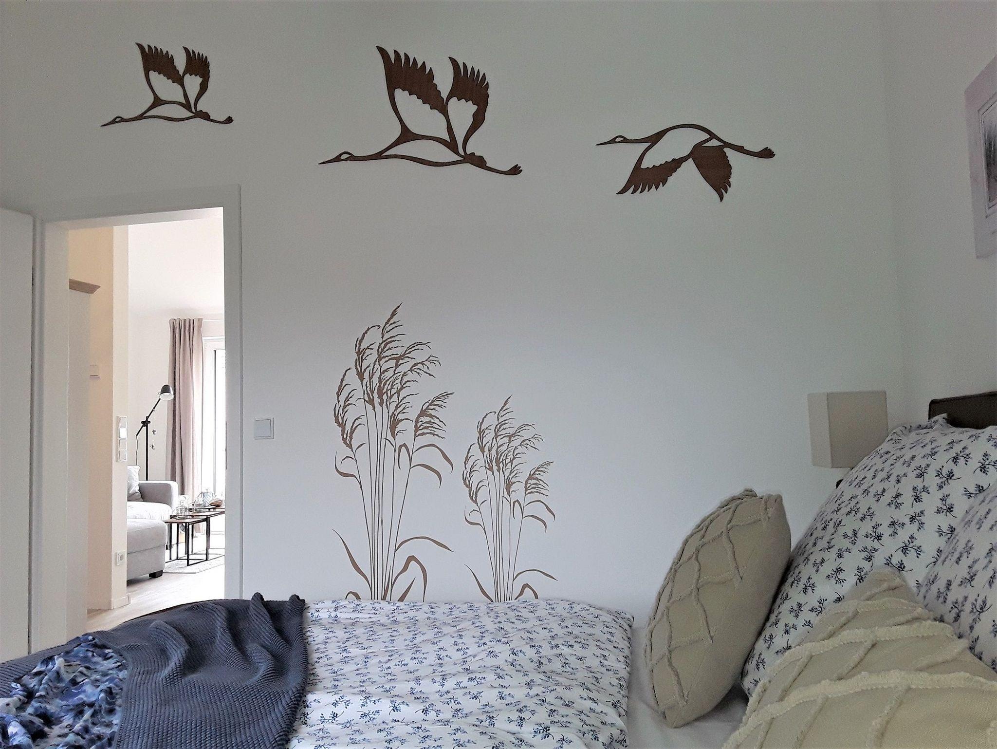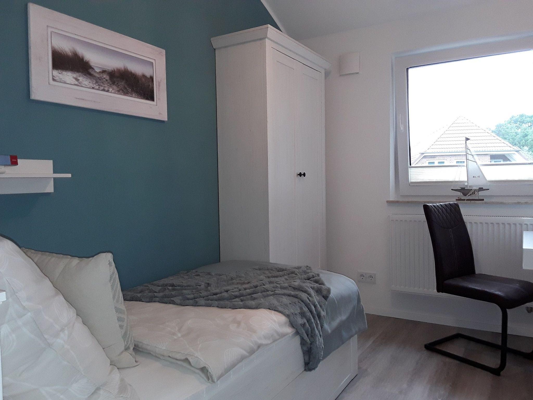 In dem kleineren Schlafzimmer befindet sich ein Einzelbett, ein Schreibtisch und ein weiterer Kleiderschrank. Eine zusätzliche Schlafmöglichkeit bietet das mit einem hochwertigen Boxspringfederkern ausgestattete Ecksofa im Wohnzimmer.