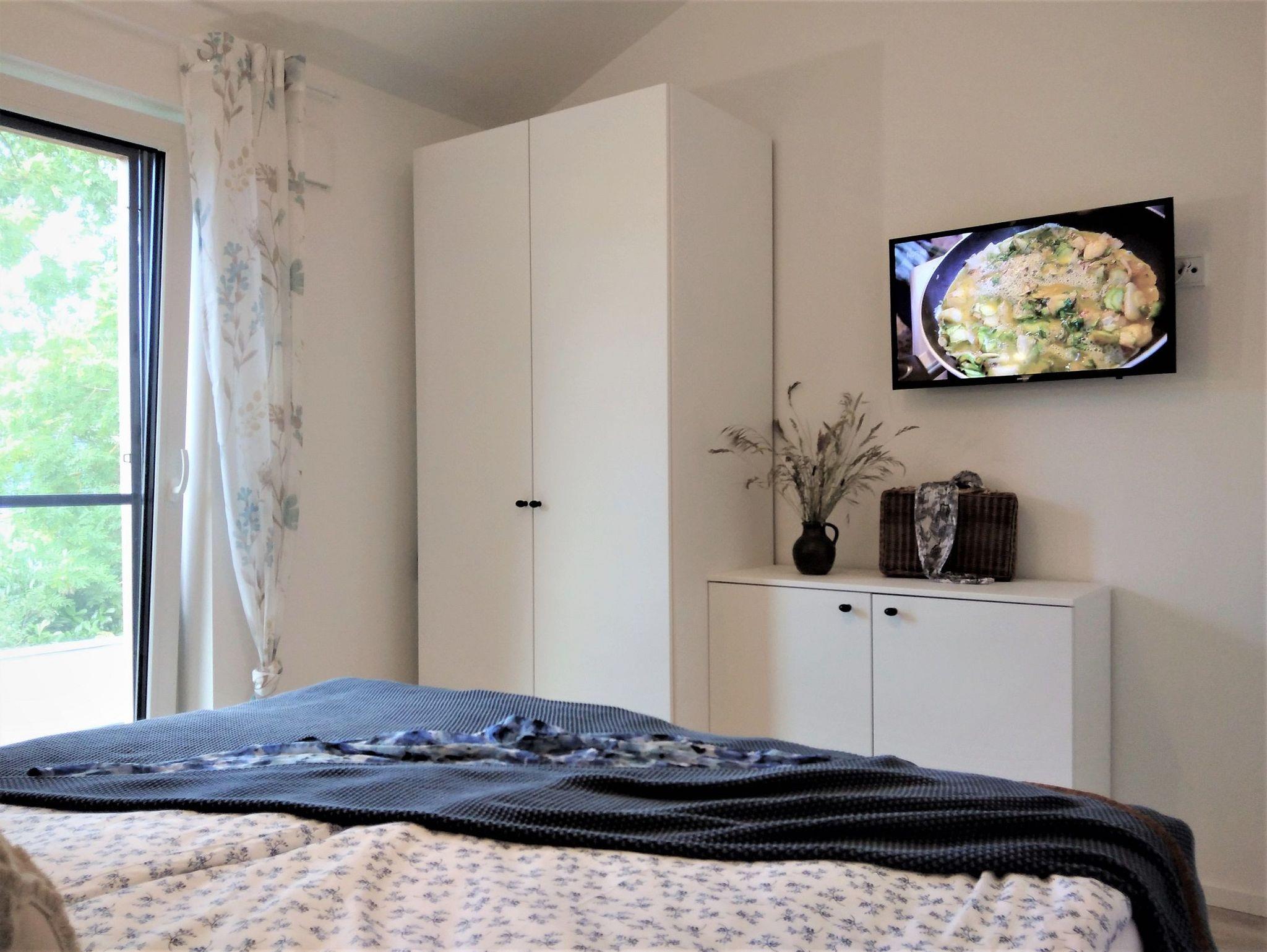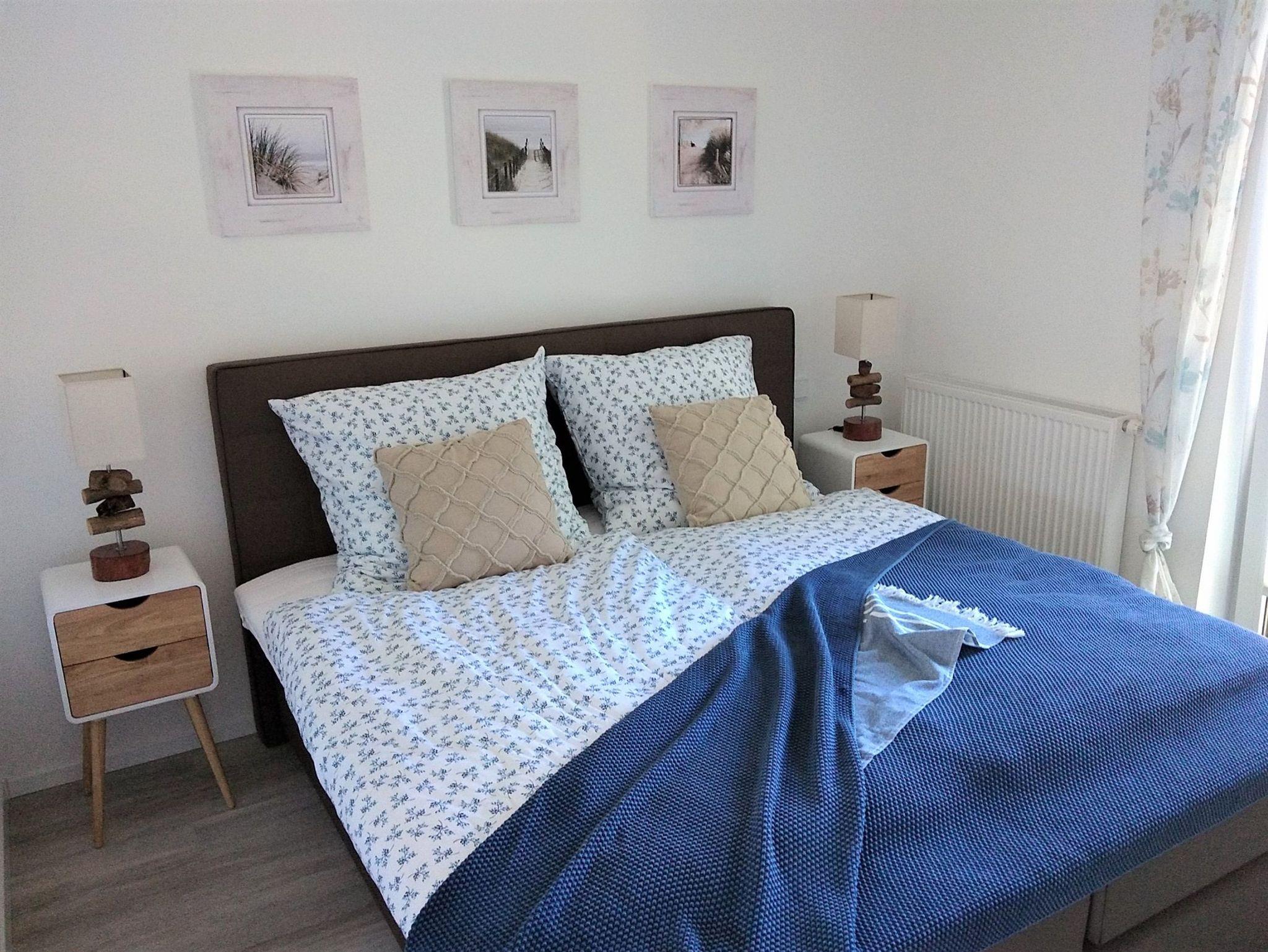 Das geschmackvoll eingerichtete Schlafzimmer verwöhnt mit einem Boxspringdoppelbett und sorgt für einen erholsamen Schlaf. Auch an einen zweiten Smart-TV wurde gedacht.