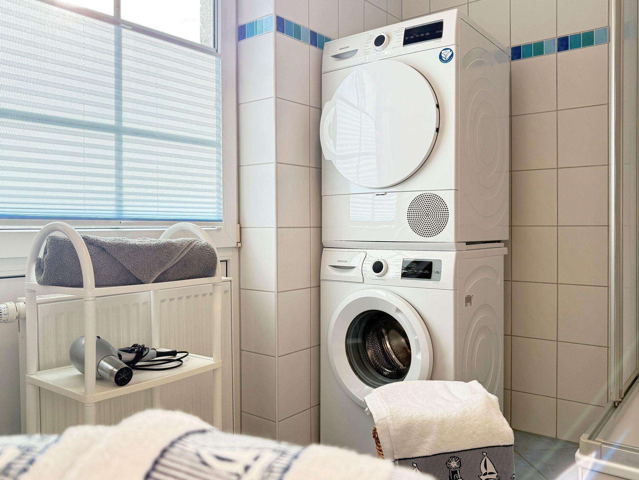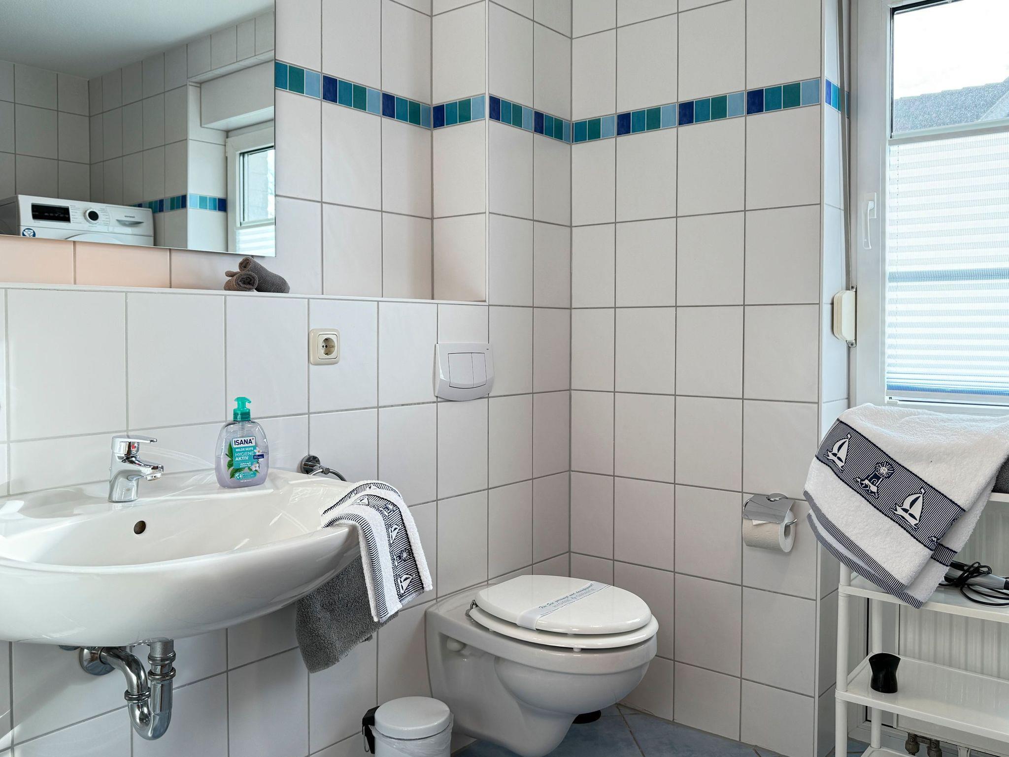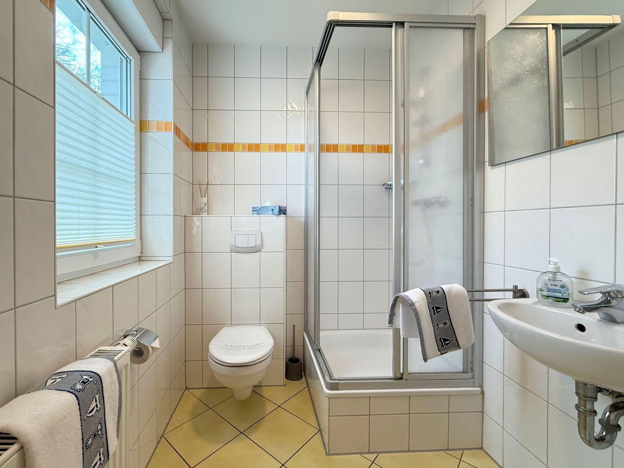 • Badezimmer 1: Ebenerdige Dusche/WC mit Fußbodenheizung und Haartrockner