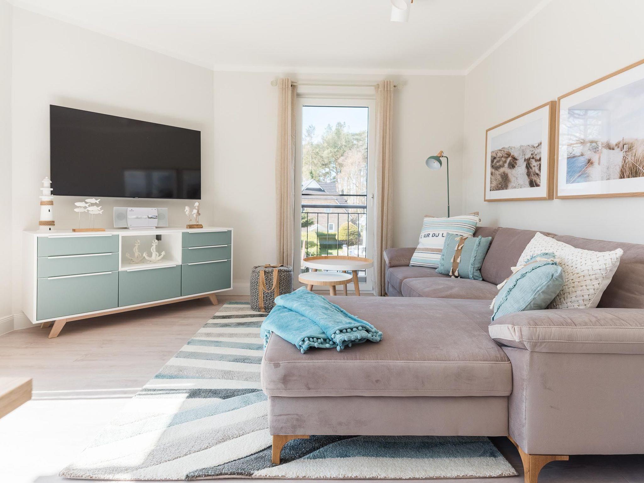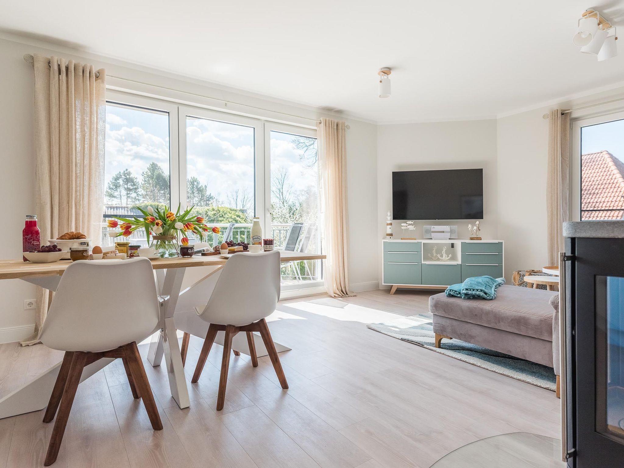 Bodentiefe Fenster lassen den maritimen und zugleich eleganten Charme des lichtdurchfluteten Apartments besonders zur Geltung kommen.