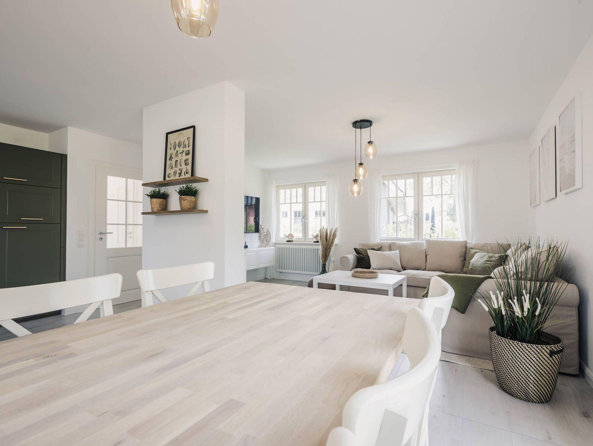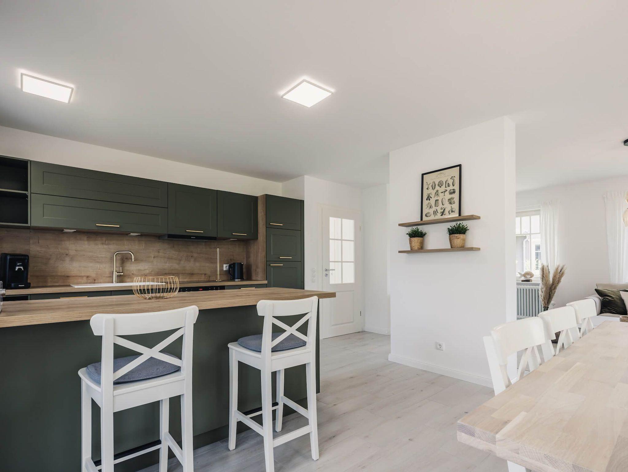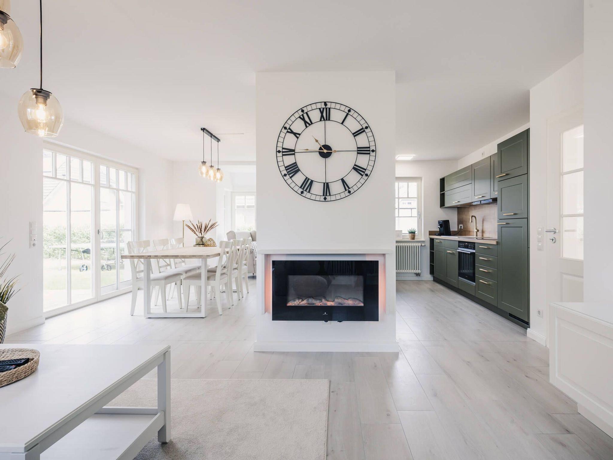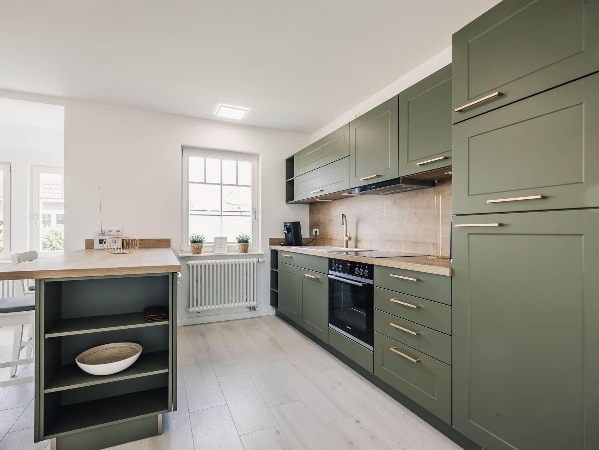Das Konzept Olivia zieht sich wie ein Faden von der olivfarbenen Außenfassade durch die hellen und offenen Wohnräume bis hin zum Interieur