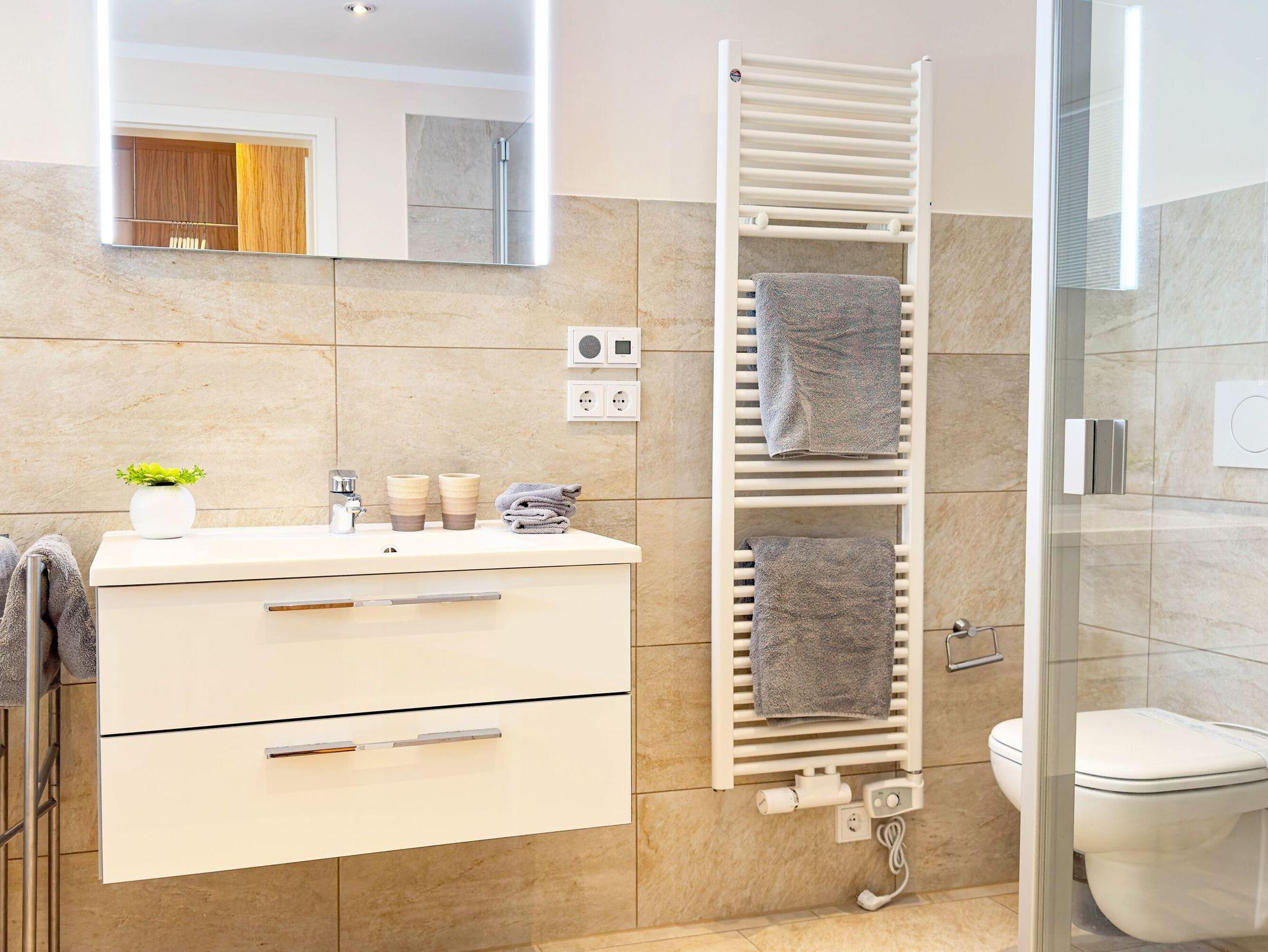 • Badezimmer: Zwei moderne Bäder eines mit Badewanne und Dusche, eines mit Dusche und WC, beide mit Fußbodenheizung