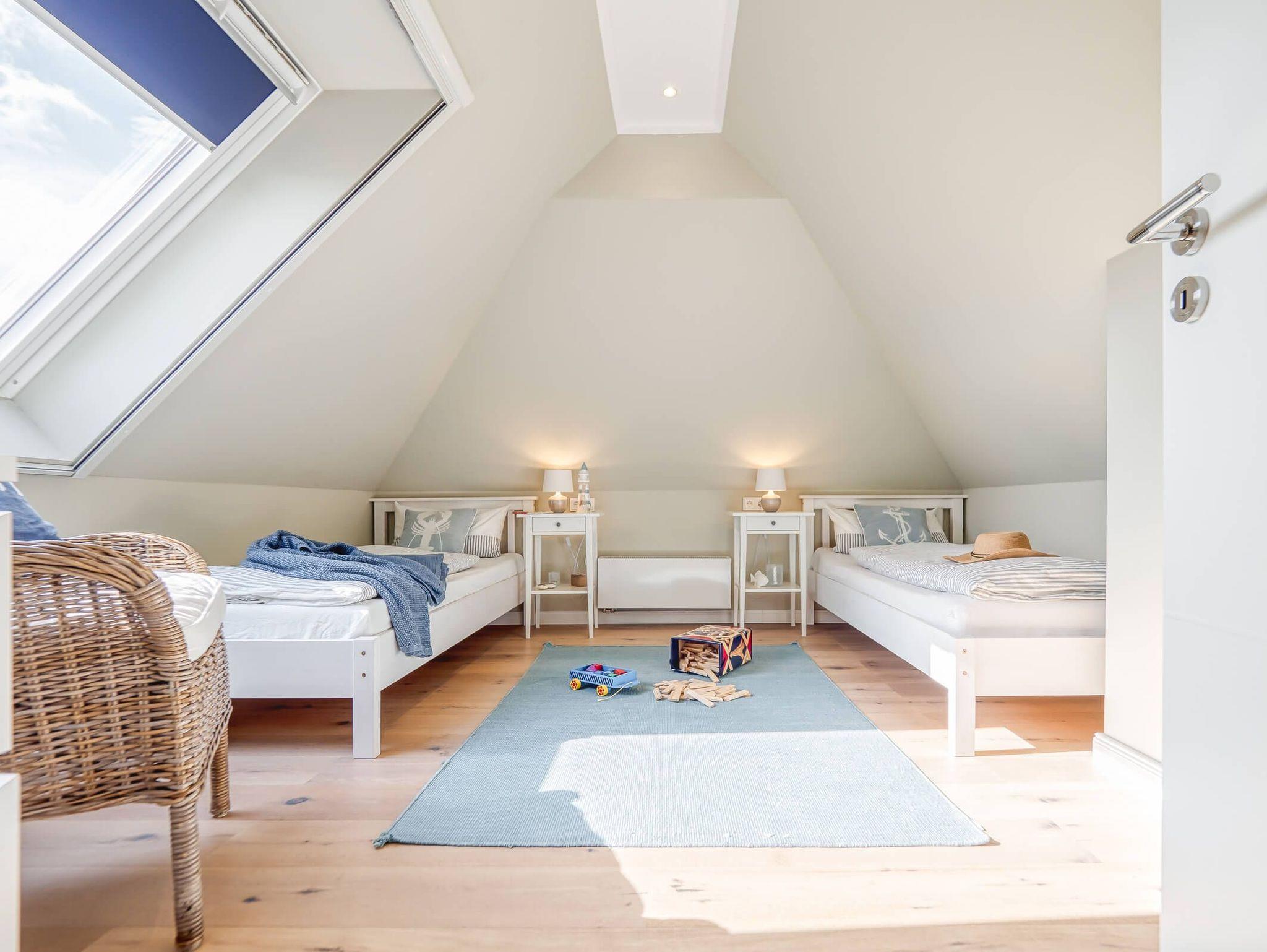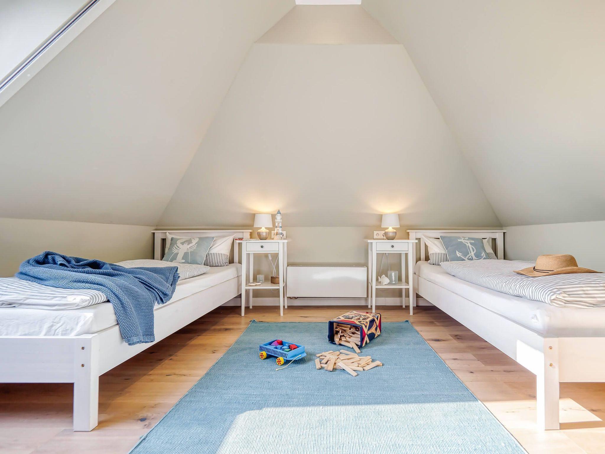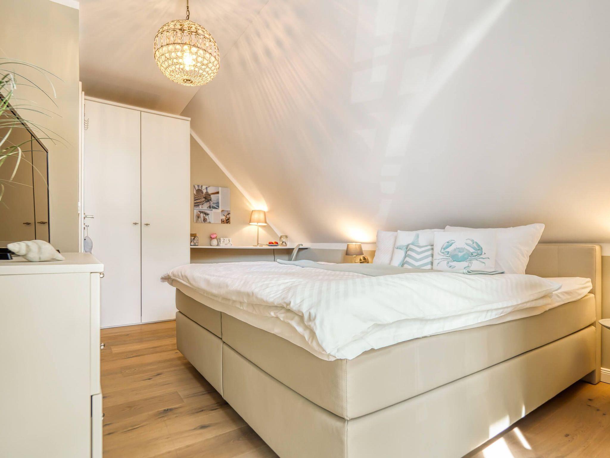 • Zwei Schlafzimmer: Ein Schlafzimmer mit luxuriösem Boxspringbett und ein Dachgeschosszimmer mit zwei Einzelbetten