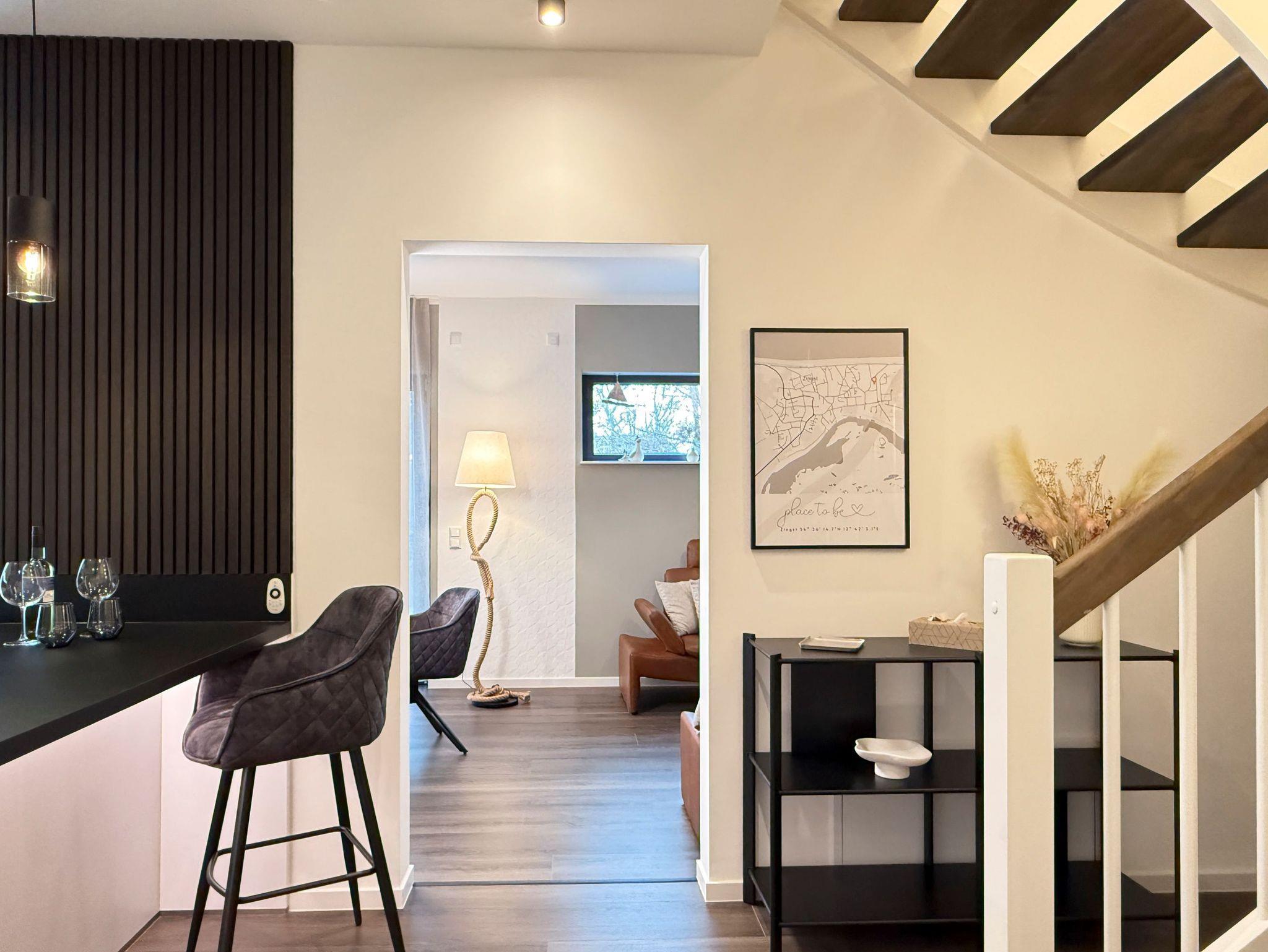 Das Ferienhaus Kleine Auszeit empfängt Sie mit einer gemütlichen und modernen Einrichtung. Der helle Wohn- und Essbereich ist der perfekte Ort, um den Tag entspannt ausklingen zu lassen ob bei einem guten Buch oder einem gemeinsamen Filmabend. In der voll ausgestatteten Küchenzeile können Sie mühelos Ihre Lieblingsgerichte zubereiten.