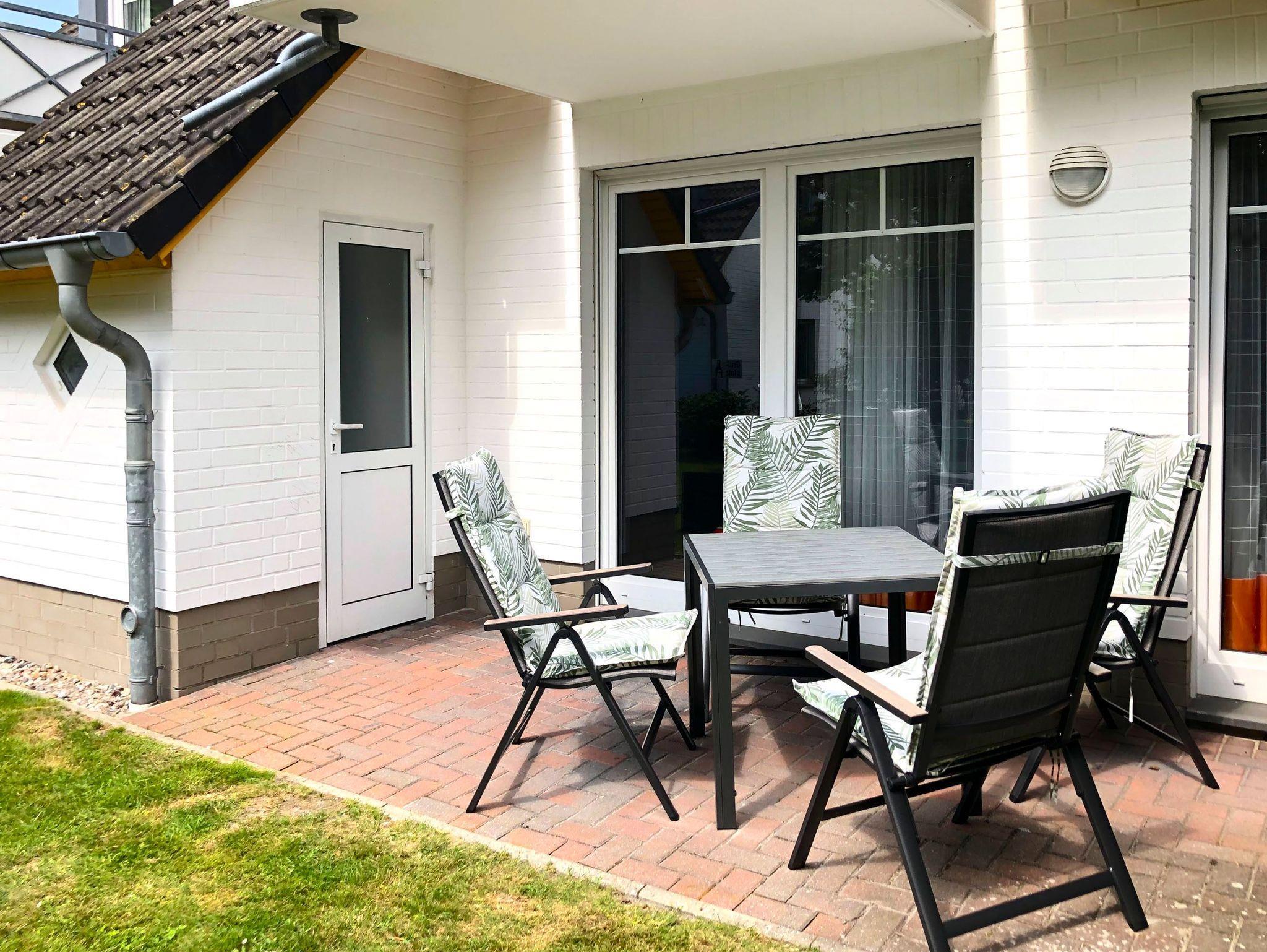 Beginnen Sie den Tag auf der sonnigen Südterrasse mit Blick ins Grüne und genießen Sie die frische Meeresbrise. Nach einem Tag an der Ostsee bietet die Terrasse den perfekten Ort, um bei einem Glas Wein zu entspannen. Ein Sonnenschirm steht für gemütliche Stunden im Freien zur Verfügung.