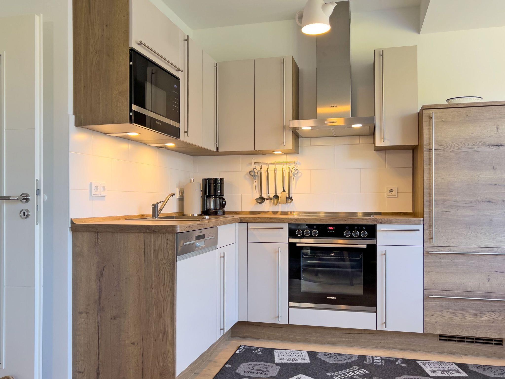 • Küche und Essbereich: Moderne, voll ausgestattete Küche mit Kochfeld, Backofen, Mikrowelle, Geschirrspüler, Kühlschrank, Filterkaffeemaschine, Toaster und Wasserkocher.