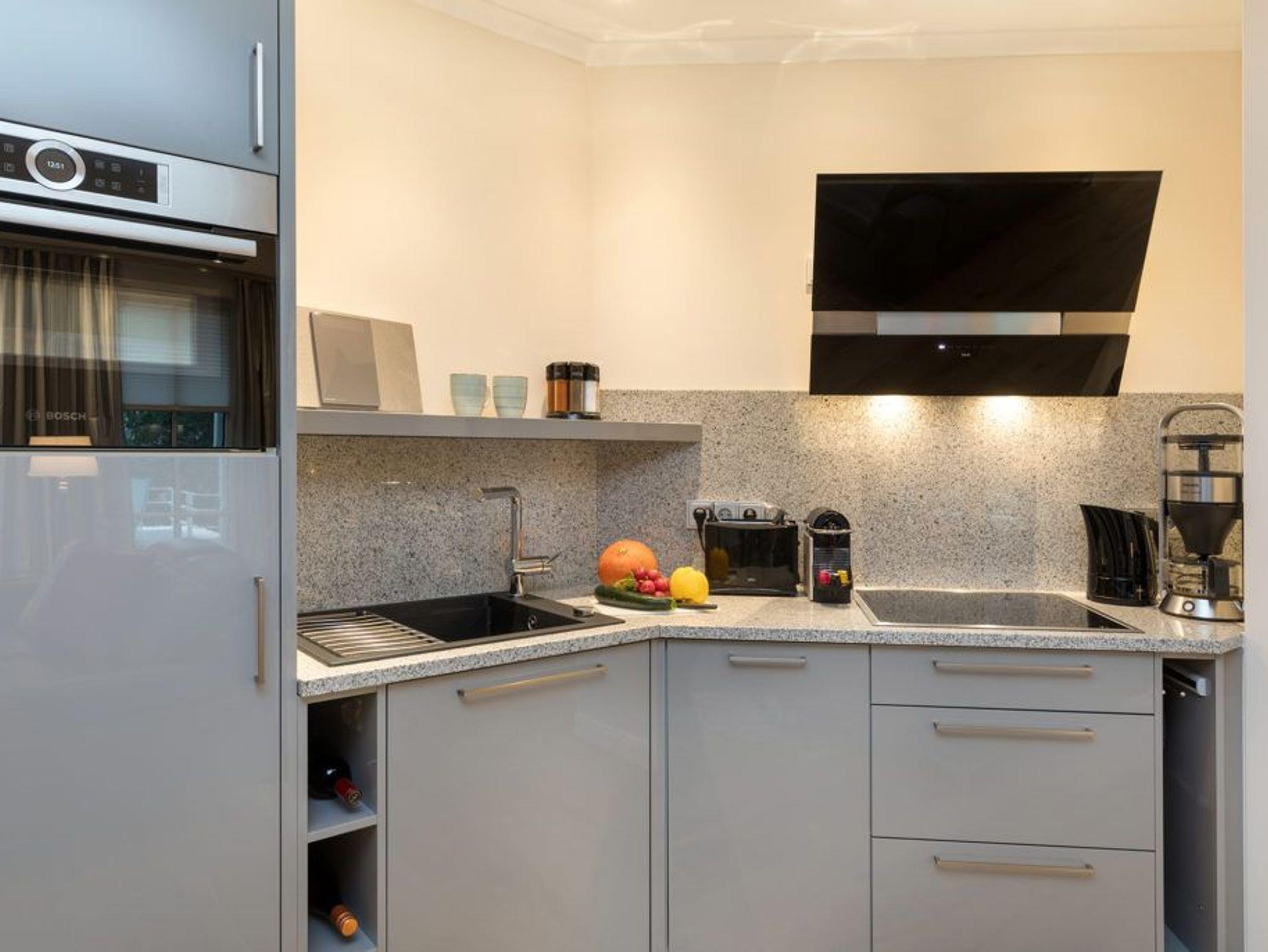 • Küche und Essbereich: Offene, voll ausgestattete Küche mit Granit-Arbeitsplatte, Ceran-Kochfeld, Backofen mit integrierter Mikrowelle, Geschirrspüler, Kühlschrank mit Gefrierfach, Nespresso-Maschine, Filterkaffeemaschine, Toaster und Wasserkocher. Die angrenzende Essgruppe lädt zu geselligen Mahlzeiten ein.