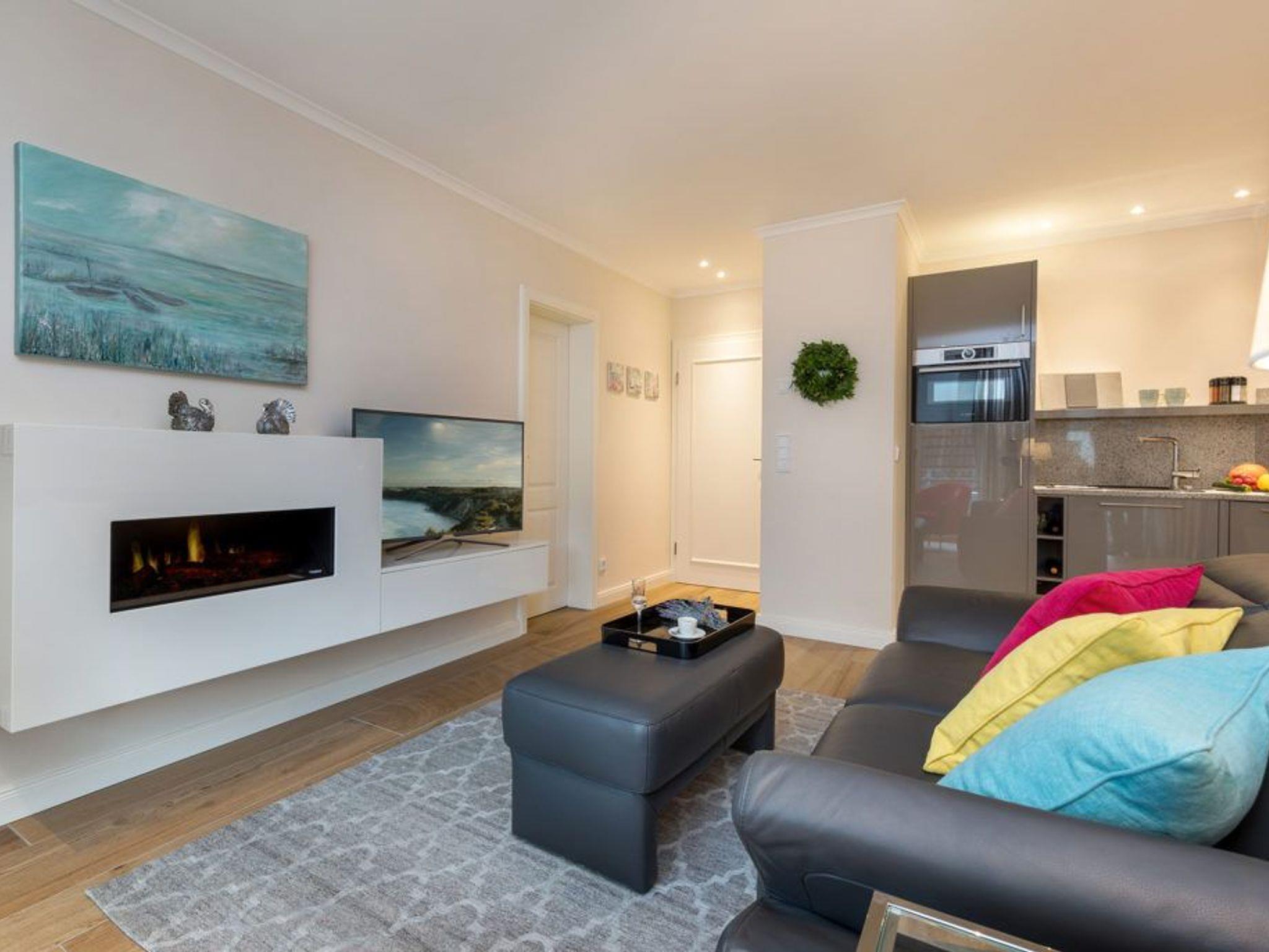 • Wohnbereich: Heller Wohnraum mit bequemer Sitzgruppe, elektrischem Kamin, Flachbild-TV und Zugang zum Balkon für entspannte Stunden.