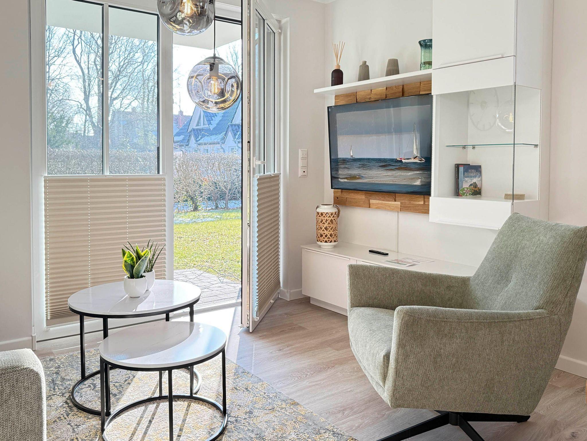 • Wohnbereich: Heller Wohnraum mit bequemer Sitzgruppe und Smart-TV für entspannte Stunden.