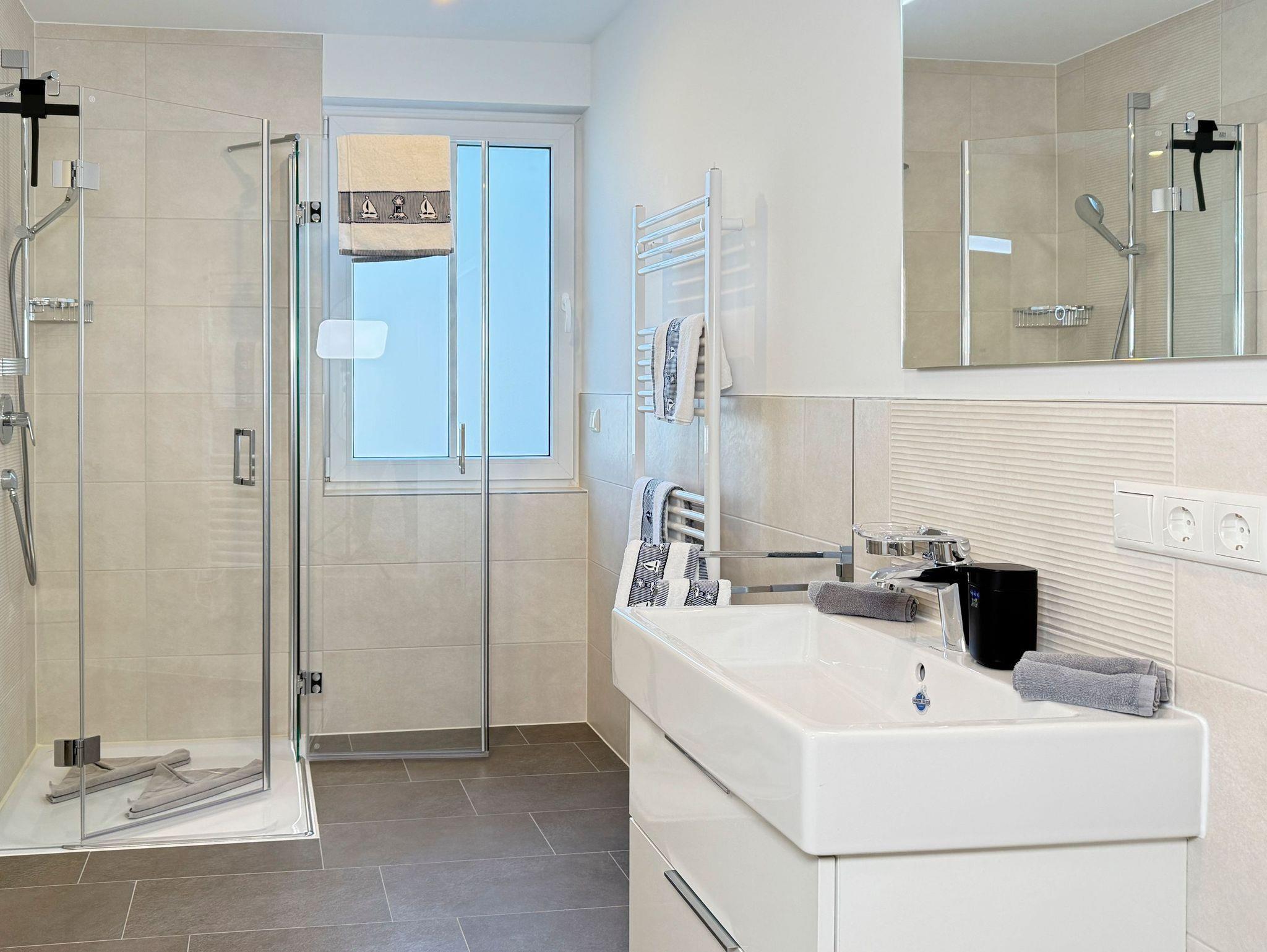 • Badezimmer: Modernes Bad mit ebenerdiger Dusche, Fußbodenheizung und Haartrockner für zusätzlichen Komfort.