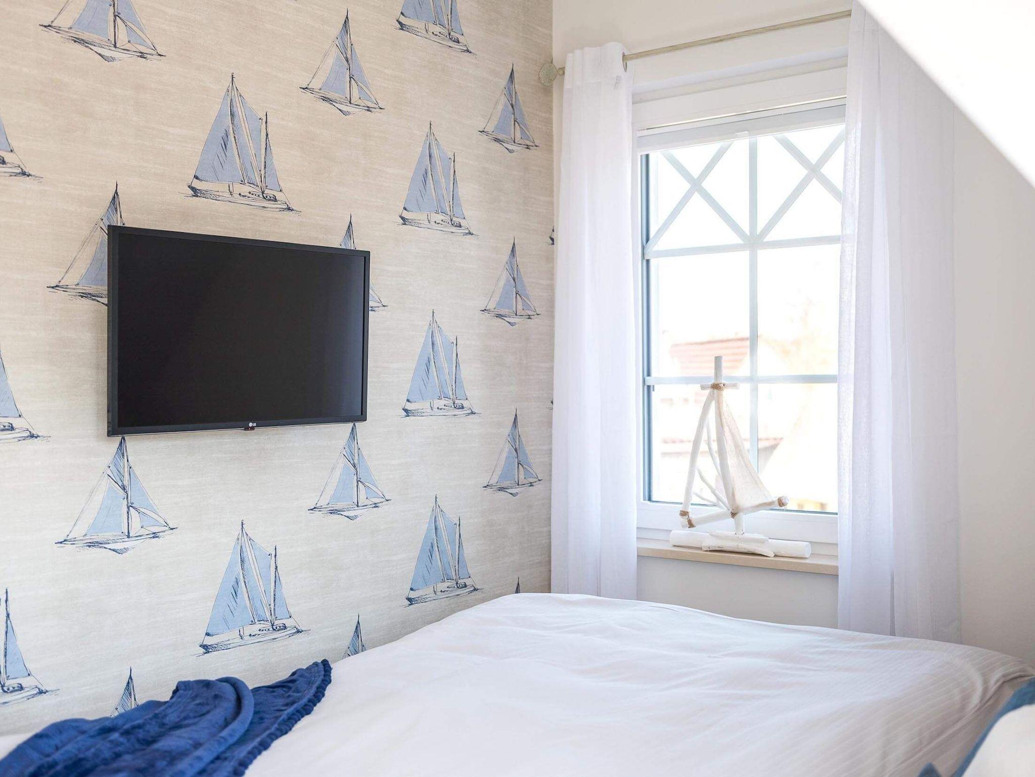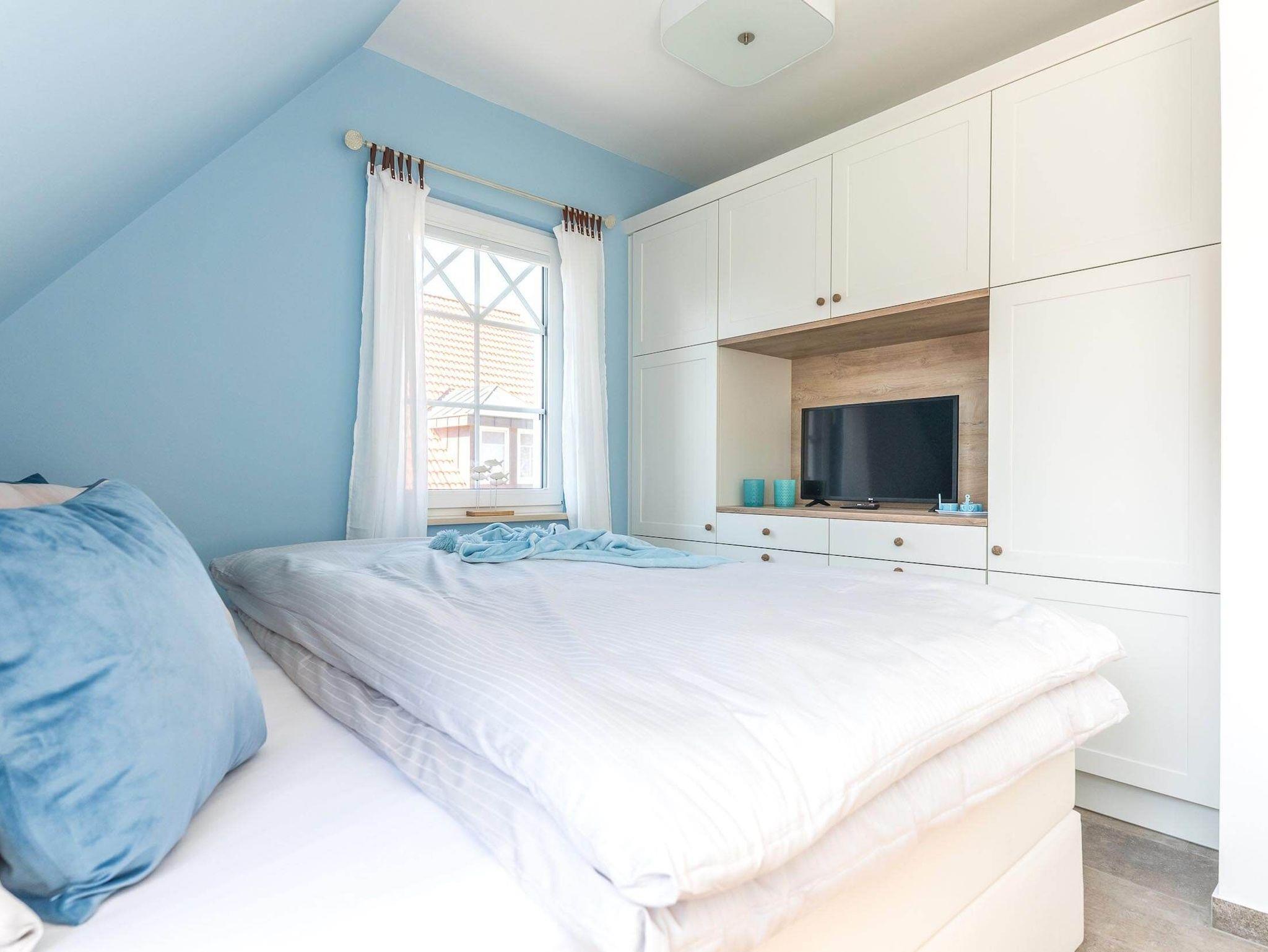 Im Obergeschoss sind die drei anheimelnden Schlafzimmer mit Boxspringbetten und Flatscreen TV Ihr Entspannungsbereich des behaglichen Hauses. Hier befindet sich ein großes Badezimmer mit geräumiger Dusche und WC.