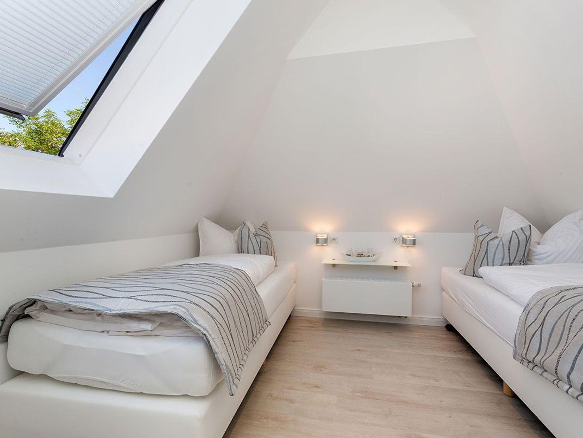 Im Obergeschoss erwarten Sie zwei traumhafte Schlafzimmer mit Boxspringbetten und eigenem Flachbild-TV, ergänzt durch ein stilvolles Badezimmer mit Sauna und Regendusche. Hier können Sie die Seele baumeln lassen und neue Energie tanken. Das Dachgeschoss bietet ein weiteres charmantes Schlafzimmer ein behaglicher Rückzugsort, ideal für Kinder oder Freunde.