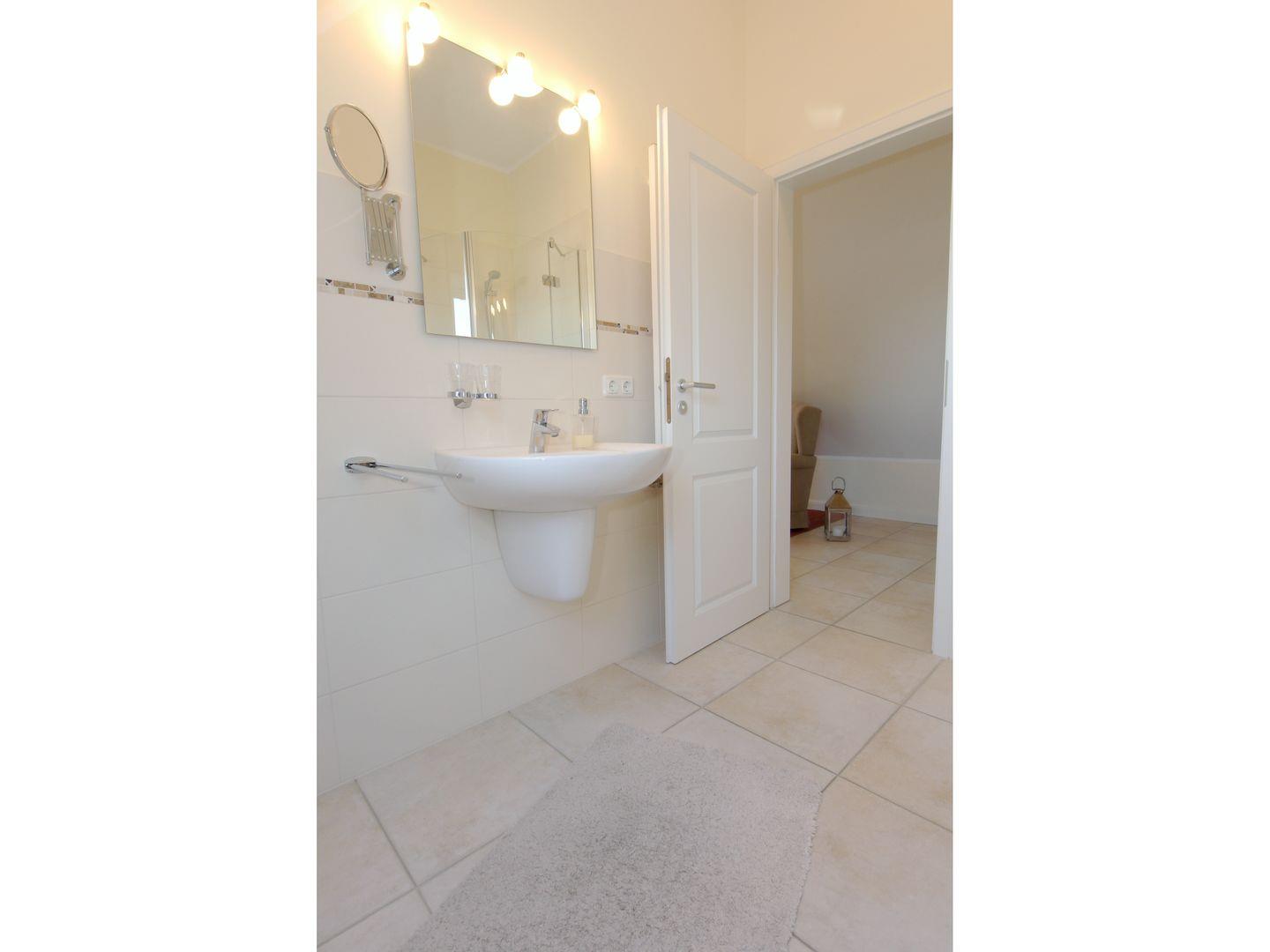 Direkt neben dem Schlafzimmer liegt das Badezimmer mit fast bodentiefer Dusche.
