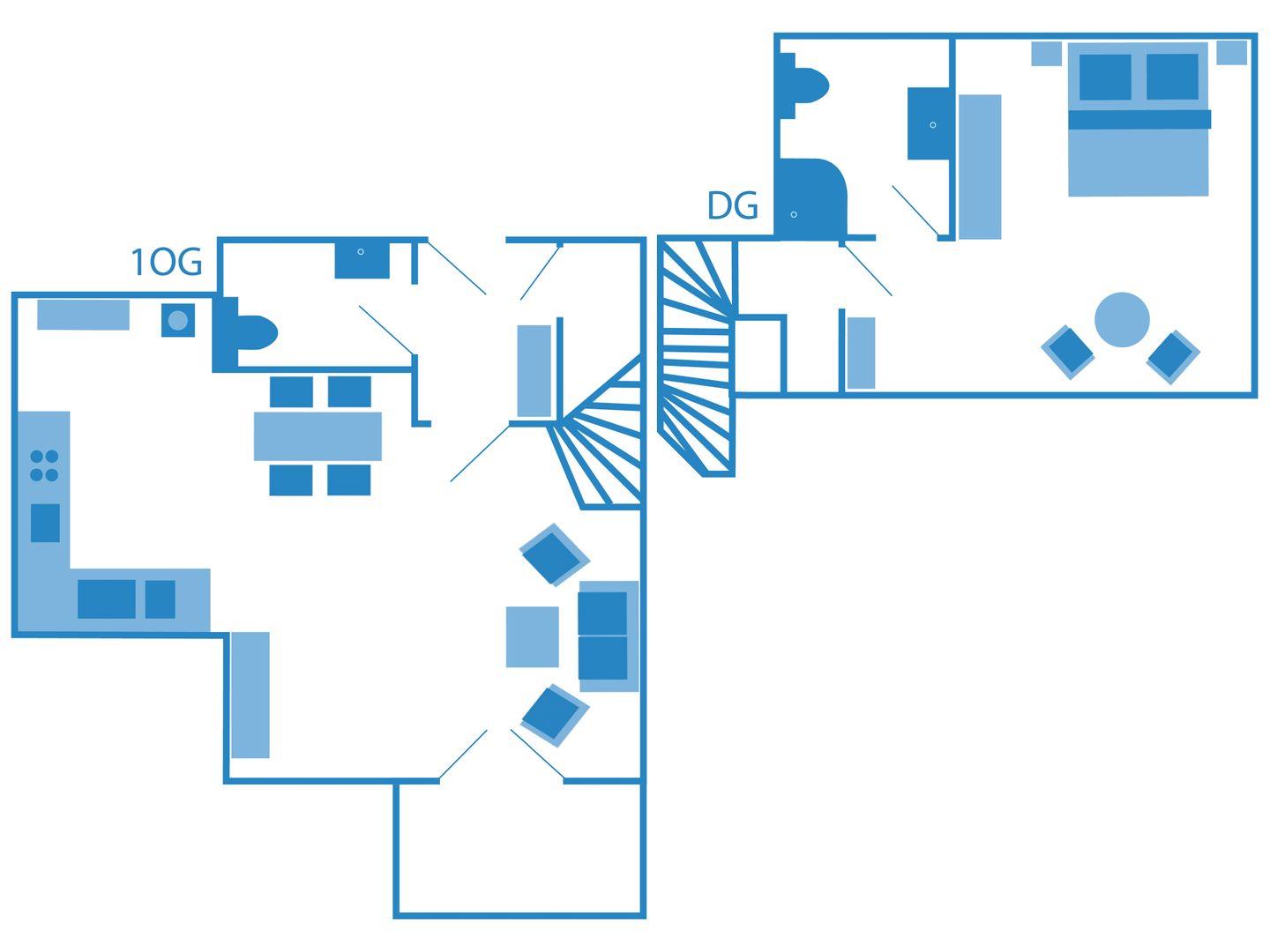 Das Schlafzimmer befindet sich eine Etage höher und ist mit einem großen Doppelbett eingerichtet, eine große Sitzecke mit zweitem Fernseher komplettiert die Ausstattung.