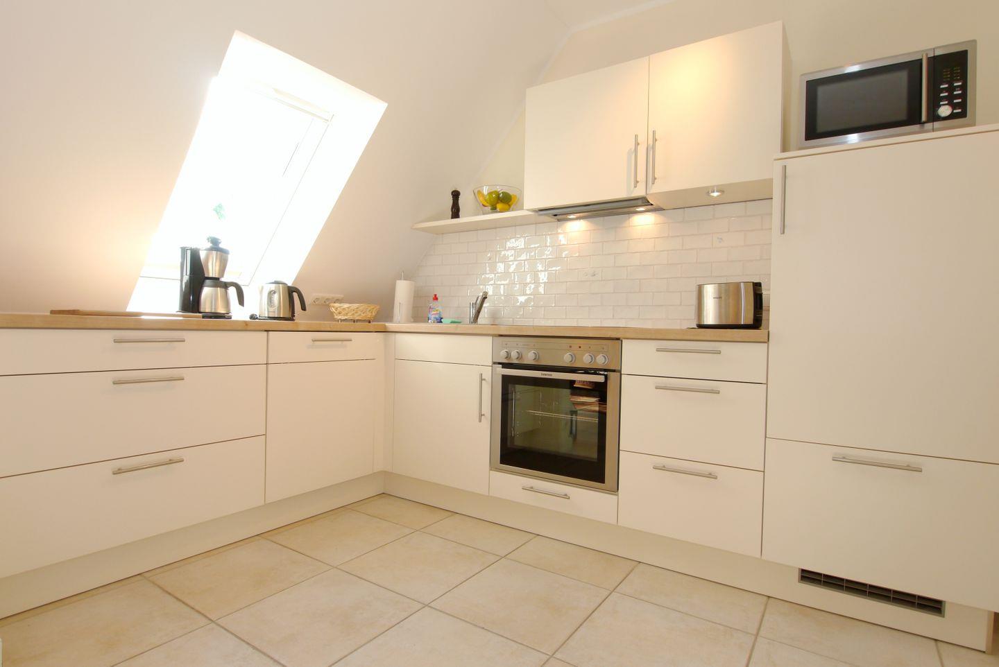 Die Küche ist umfangreich ausgestattet und mit dem Kaminofen neben der Essecke kommt auch bei kühleren Temperaturen die richtige Urlaubsatmosphäre auf.