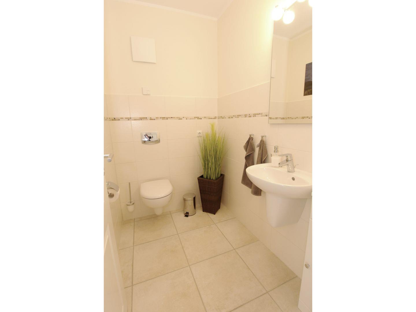 Zwei weitere Personen können im Wohnzimmer auf dem Schlafsofa aufgebettet werden und hier steht auch ein zusätzliches Gäste-WC zur Verfügung.
