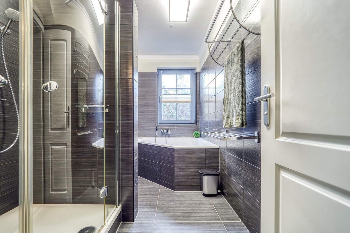 Das Bad ist mit einer Eckbadewanne und bodentiefer Vollglas-Duschkabine ausgestattet.