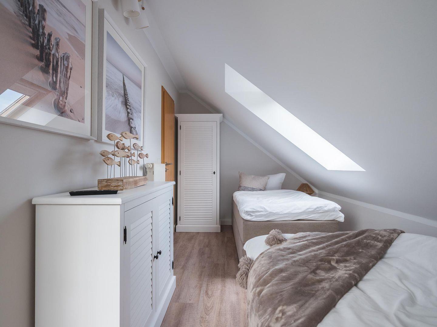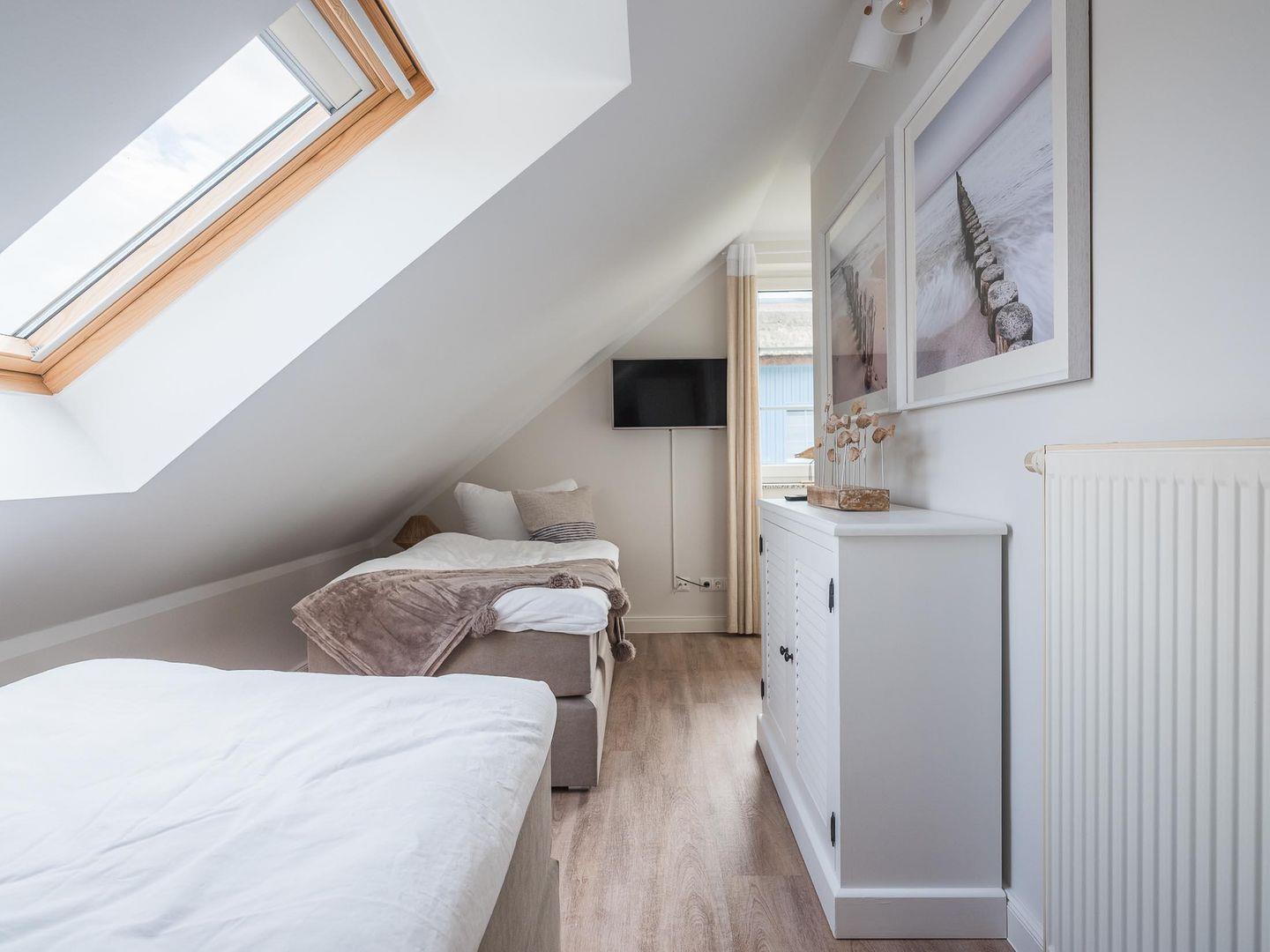 Dieses liebevoll eingerichtete Appartement liegt im Dachgeschoss eines kleinen, romantischen Hauses, das nur aus zwei Wohnungen besteht. Beide Appartments, das hier vorgestellte mit Namen AUSGUCK sowie das im Erdgeschoss befindliche Apartment SEGELMAST können einzeln (jeweils bis 4 Personen) oder auch zusammen als Haus für Familien bis 8 Personen gemietet werden. Auf einem eignen Grundstück gelegen, ist es der ideale Ort für ruhige und entspannte Stunden am Meer.
