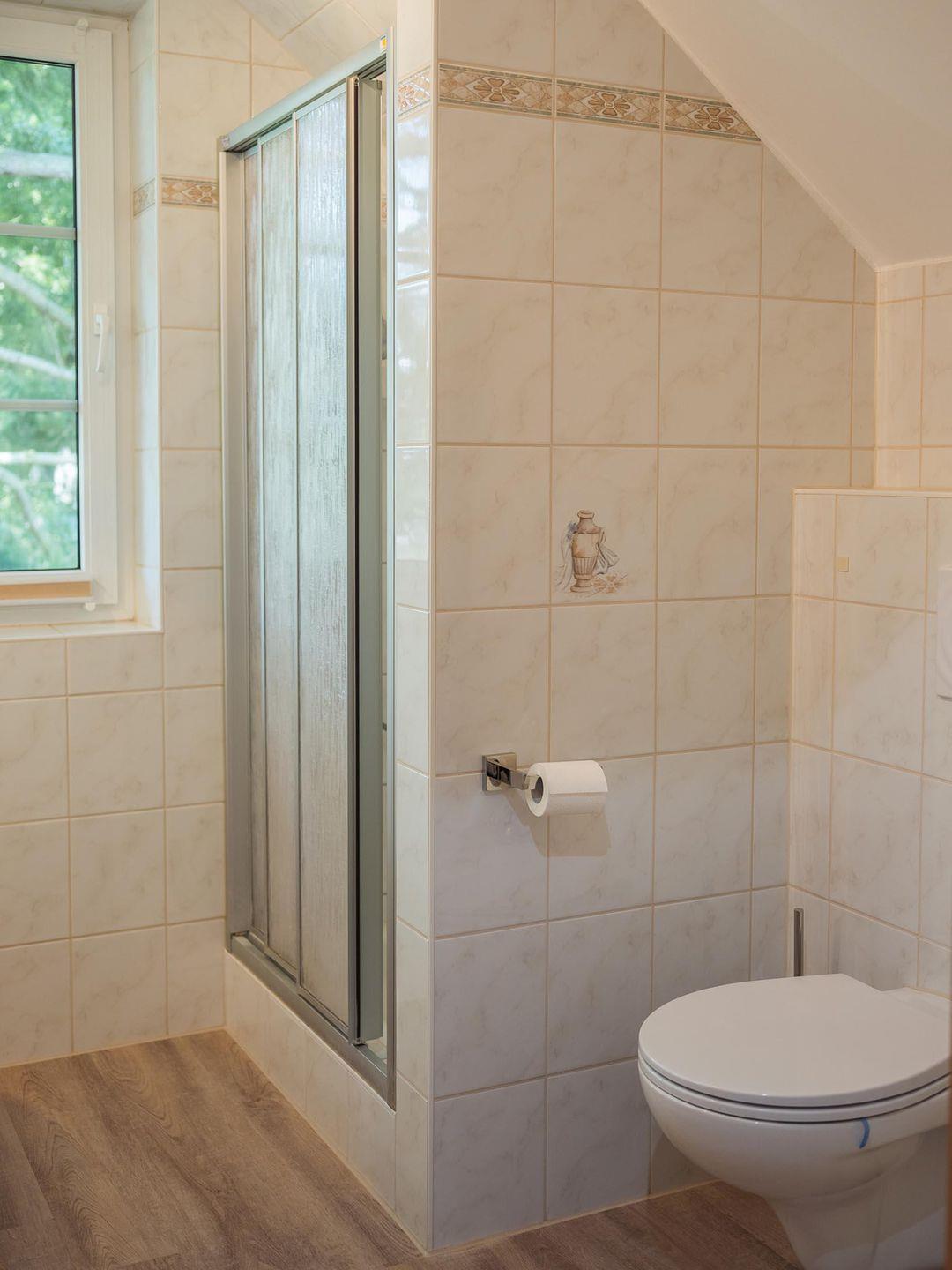 Das Badezimmer befindet sich ebenfalls im Dachgeschoss und ist mit einer Dusche sowie dem WC ausgestattet.