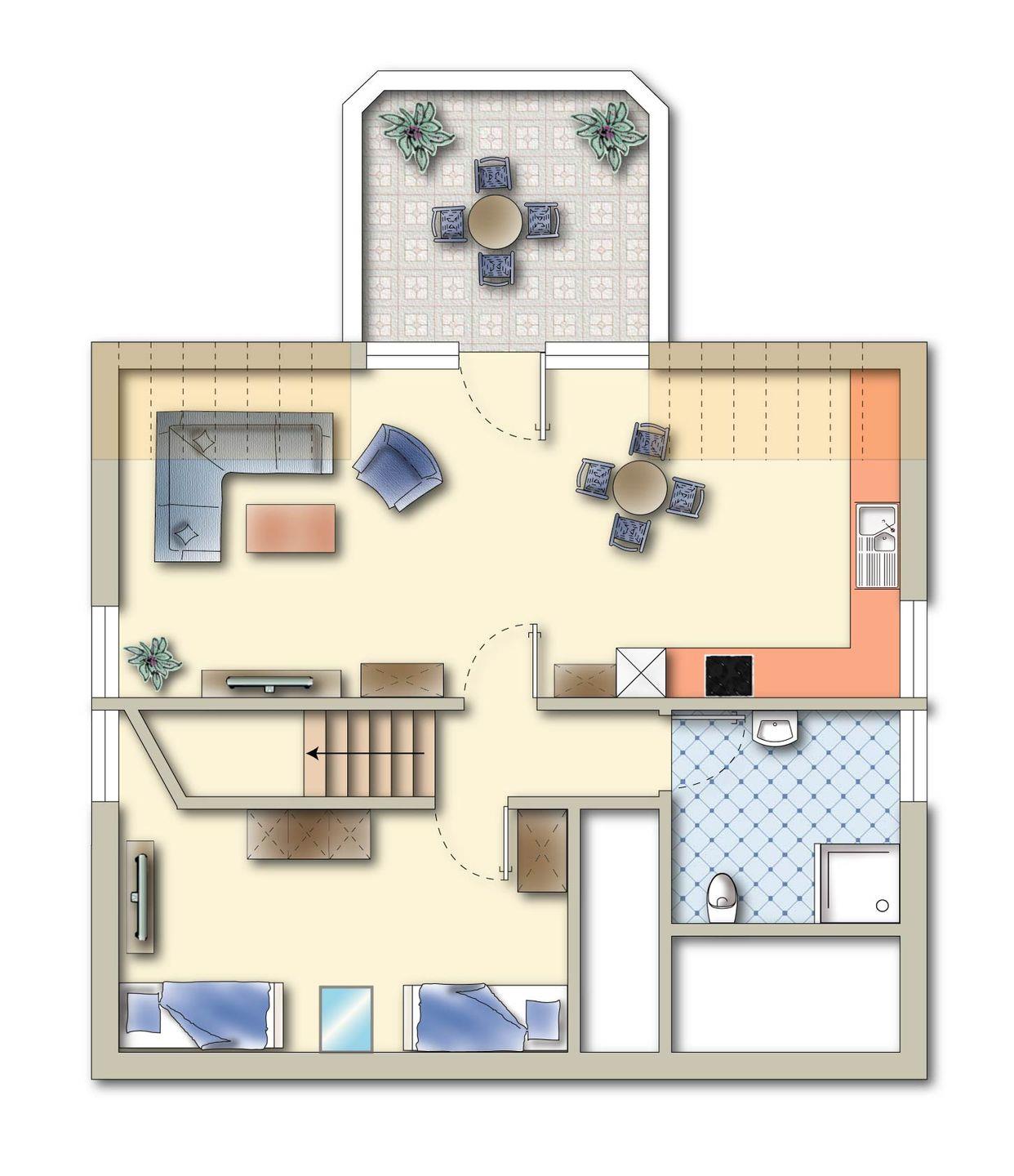 Der trotz des Dachgeschosses helle Wohnbereich diese Appartments umfasst eine urgemütliche Relaxcouch zum Entspannen sowie mit einer Schlaffunktion für zwei Personen. Der separate Essbereich grenzt an die offene Küche, die für das gemütliche Frühstück am Morgen voll ausgestattet ist.