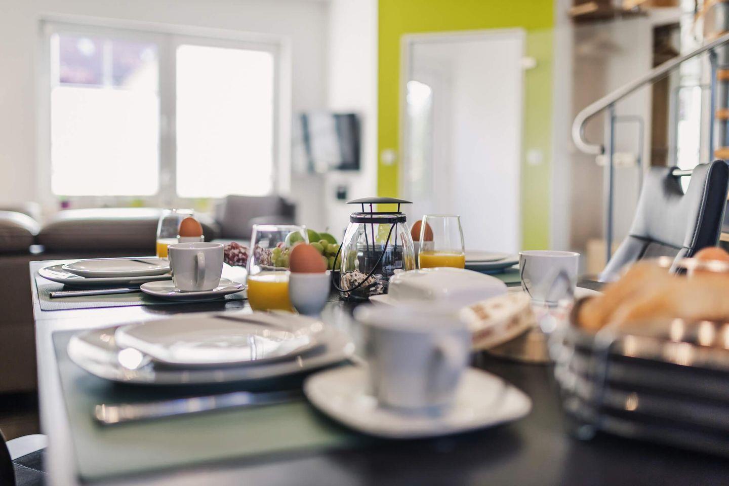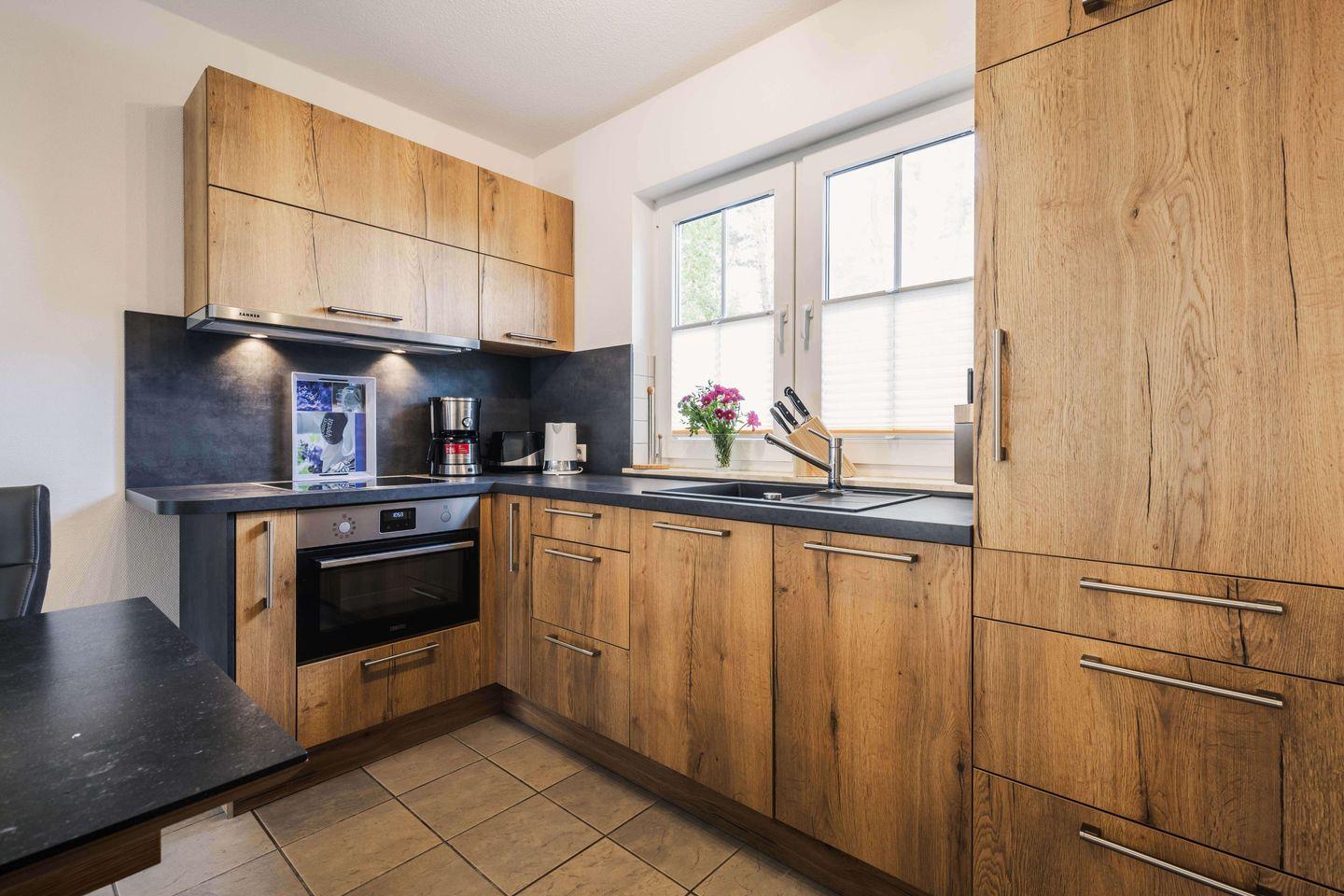Der Wohnbereich, die Küche mit Essbereich und das Masterbadezimmer befinden sich im Erdgeschoss. Der Wohnbereich ist mit einem gemütlichen Ledersofa eingerichtet. Die offene Küche mit Essbereich lädt ein zum gemütlichen Beisammensitzen und kochen. Sie verfügt über einen Geschirrspüler, einen Kühlschrank mit Gefrierfach, Herd, Mikrowelle und eine Nespresso Vertuo.