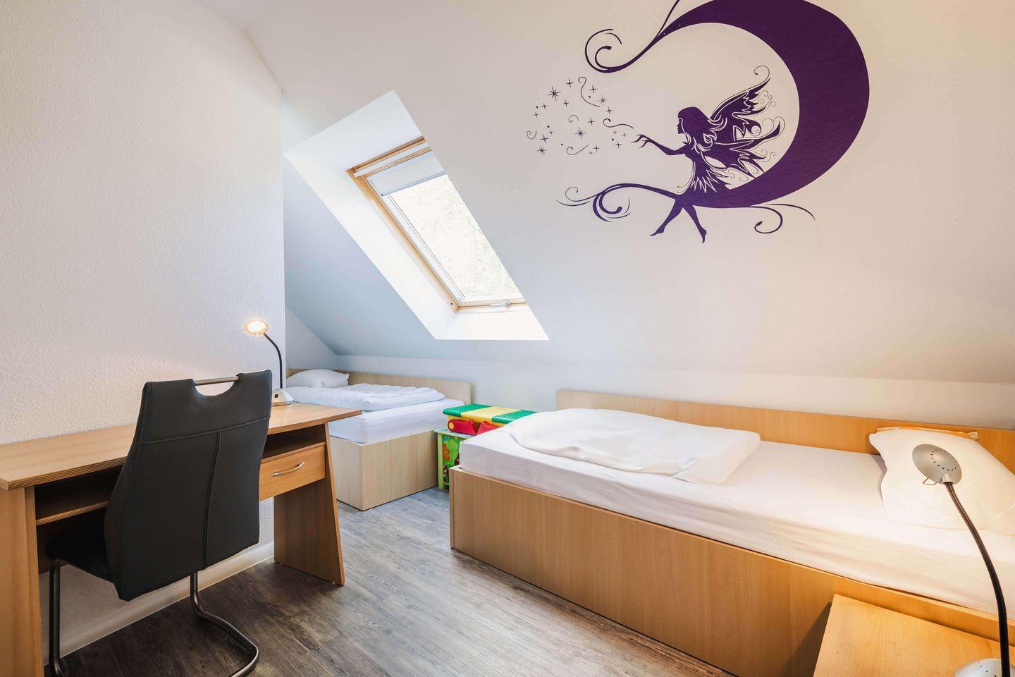 Die beiden Schlafzimmer befinden sich im Obergeschoss. Ein Schlafzimmer ist eingerichtet mit einem großen, bequemen Doppelbett, ein weiteres Schlafzimmer mit zwei Einzelbetten. Im zweiten Schlafzimmer befindet sich ein Flat-TV und ein Kleiderschrank. Beide Schlafzimmer haben Fliegengitter vor mindestens einem Fenster. Zudem befindet sich im Obergeschoss ein Gäste-WC.
