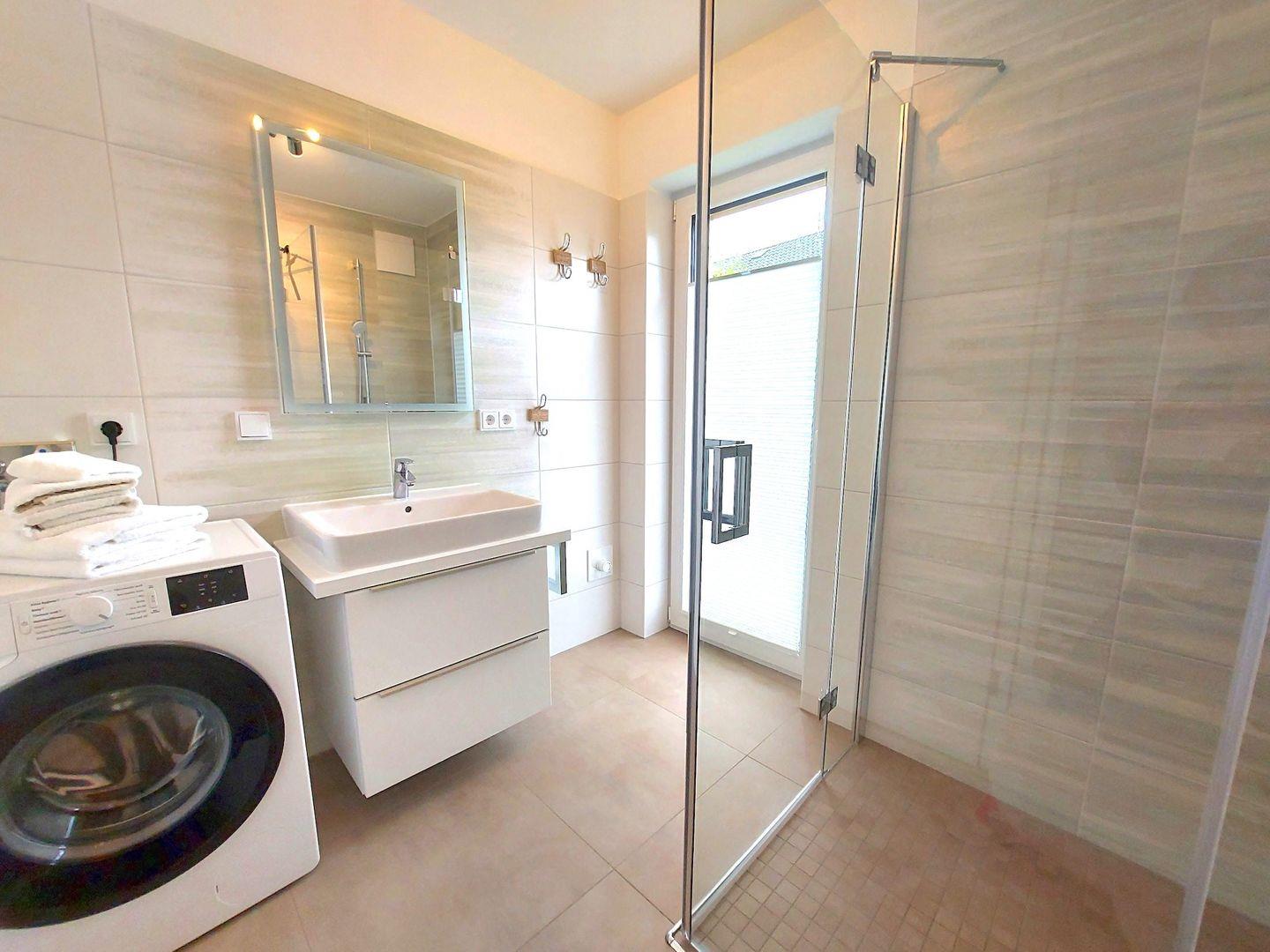 Das Badezimmer der Wohnung besticht durch klare Linien und hat eine ebenerdige Dusche sowie eine Waschmaschine.