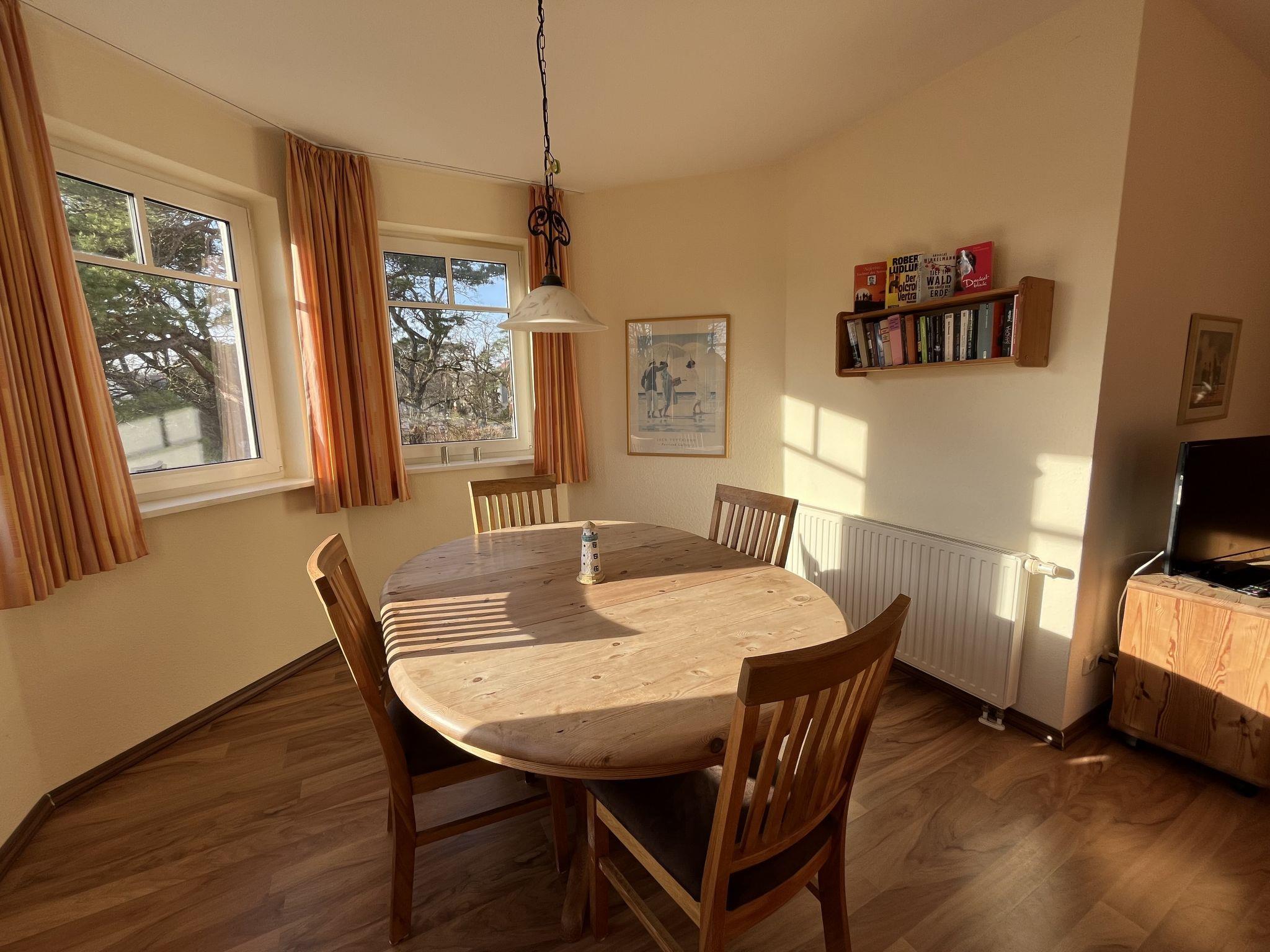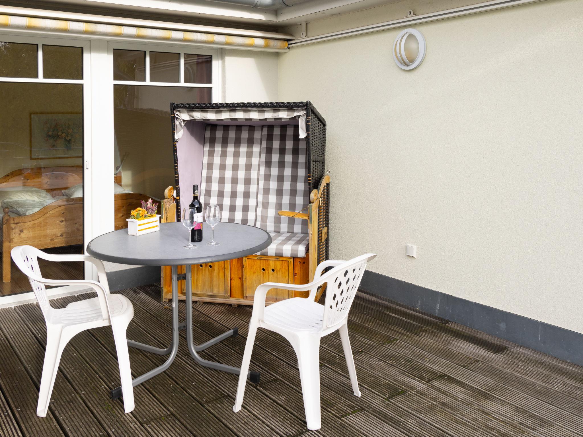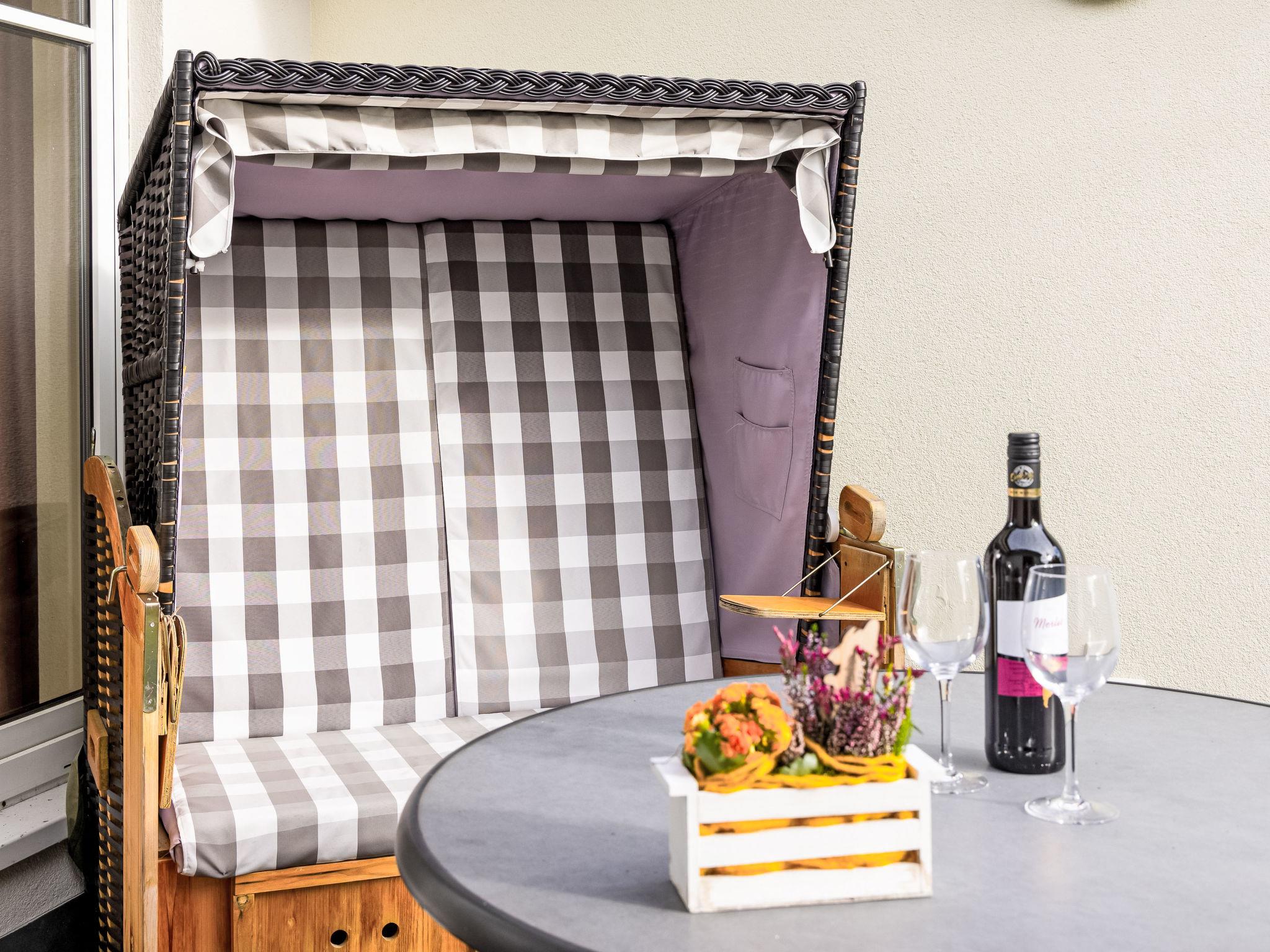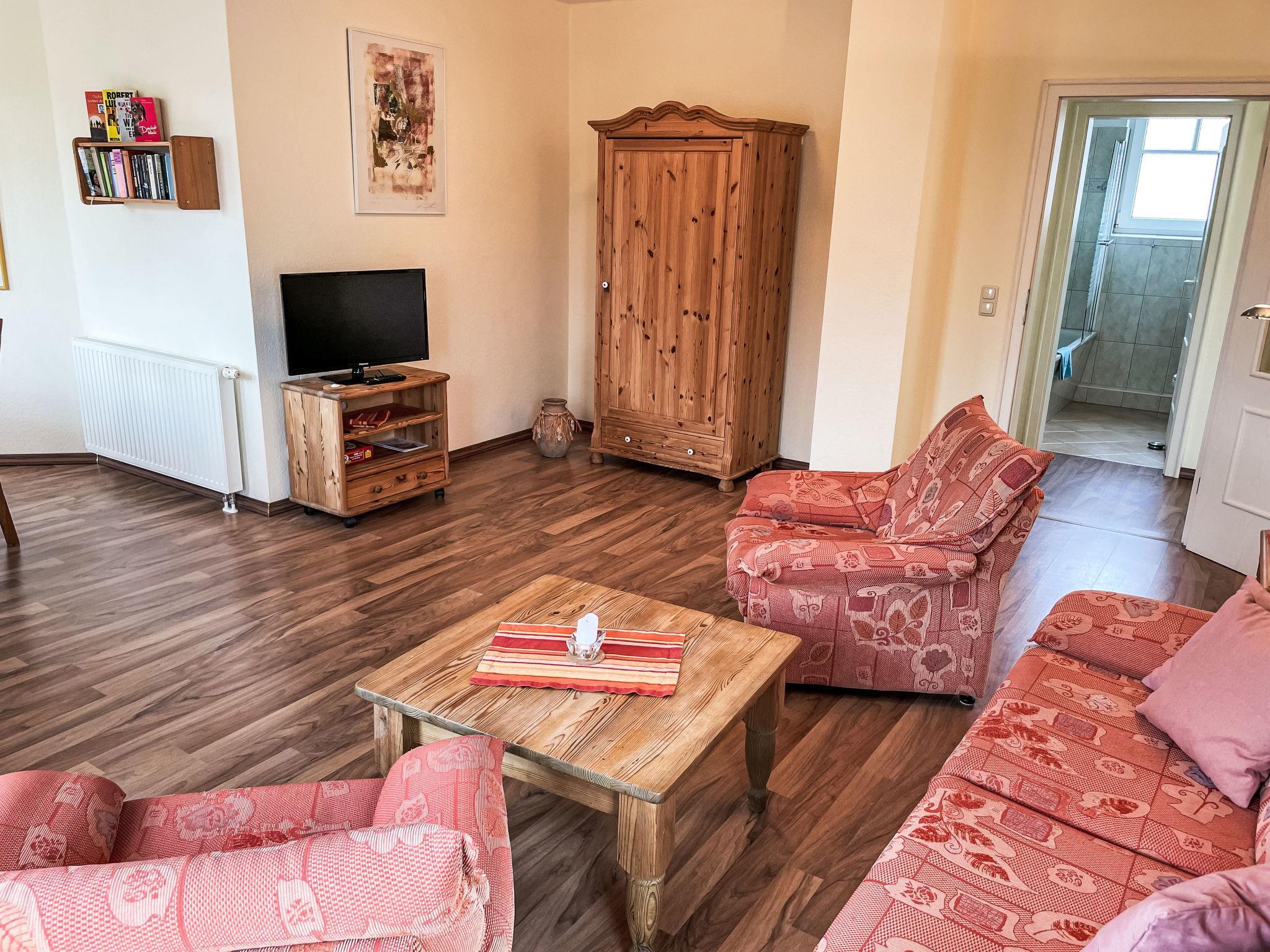 "Luise von Preußen (App.201)", 2-room apartment 69 m2 on 2nd floor. Cosy furnishings: living/dining room with 1 double sofabed and cable TV (flat screen). Exit to the terrace. 1 room with 1 double bed. Small kitchen (oven, dishwasher, 4 ceramic glass hob hotplates, toaster, kettle, electric coffee machine). Bath/WC. Terrace. Terrace furniture. Facilities: children's high chair, baby cot. Internet (WiFi). Parking (1 car) at the house. Please note: non-smokers only. Smoke alarm.
