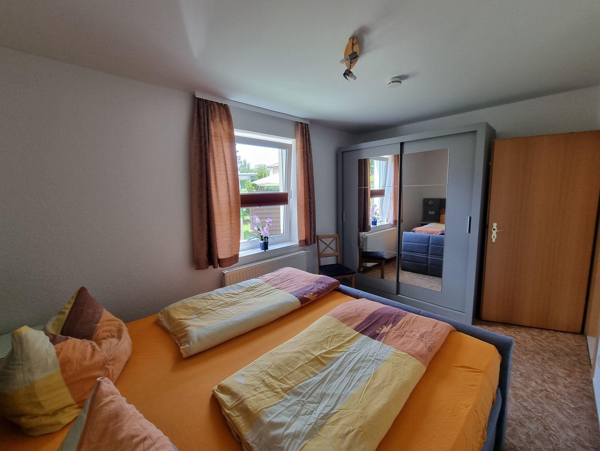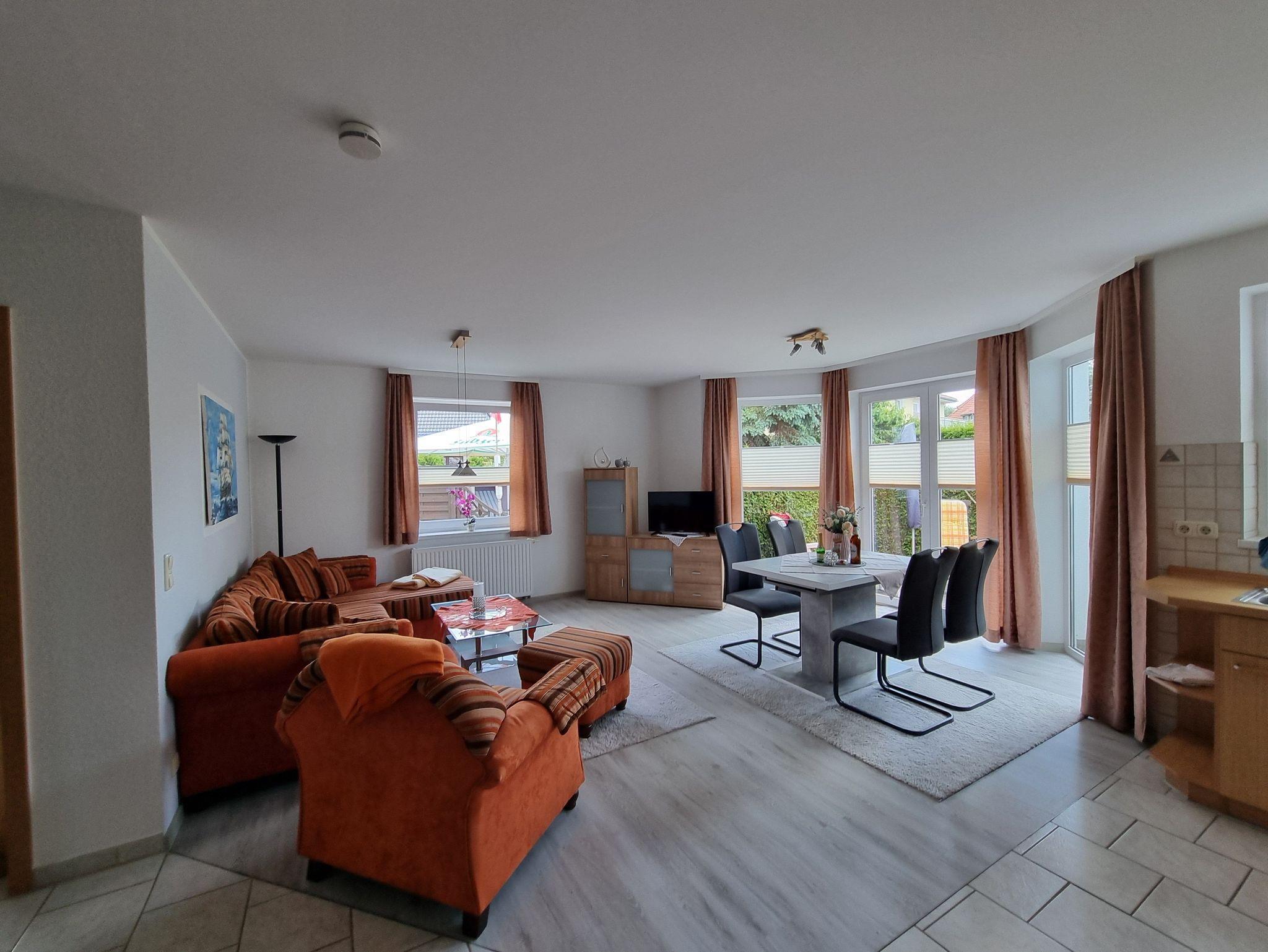 Die Ferienwohnung hat ein Schlafzimmer mit einem großen Doppelbett und ein Wohnbereich mit offener Küche. Es gibt eine gemütliche Couch, SAT-TV und eine gut ausgestattete Küche mit Essbereich.