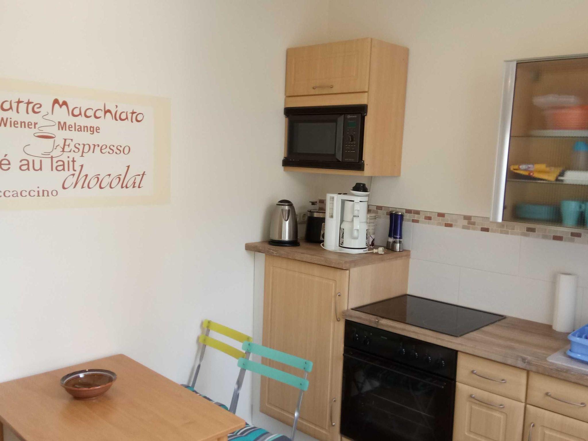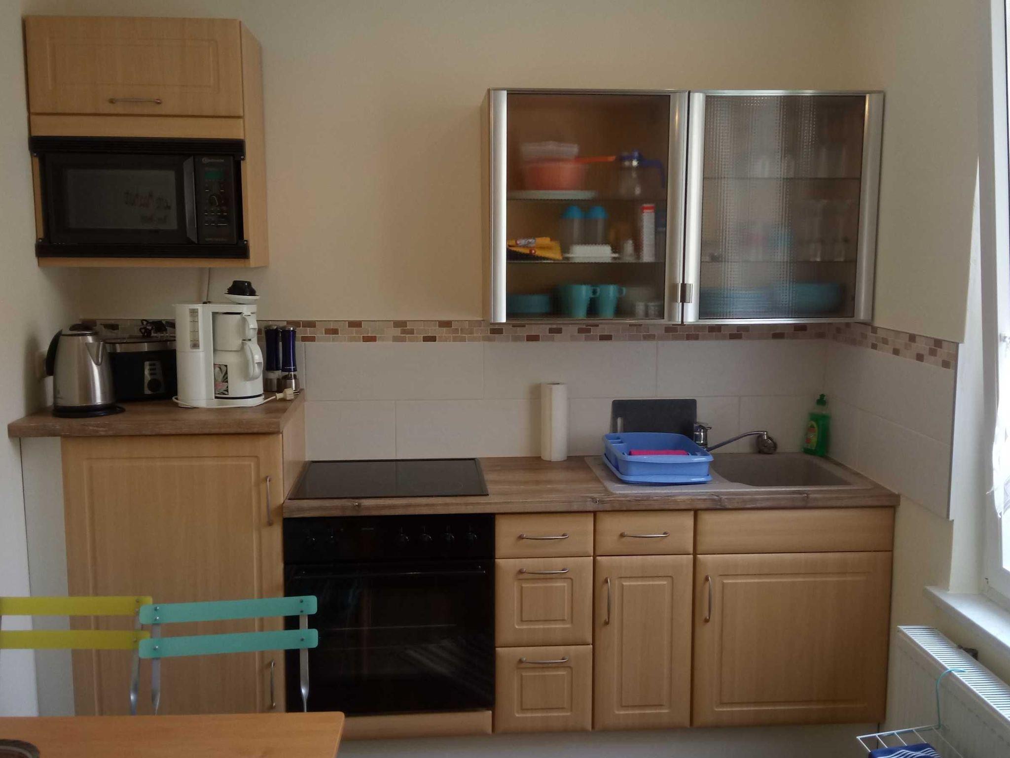 gut eingerichtete Küche mit Ceranherd, Wasserkocher, Backofen, Geschirr, Besteck, Gläser, Kaffeemaschine, Toaster, Kühlschrank
