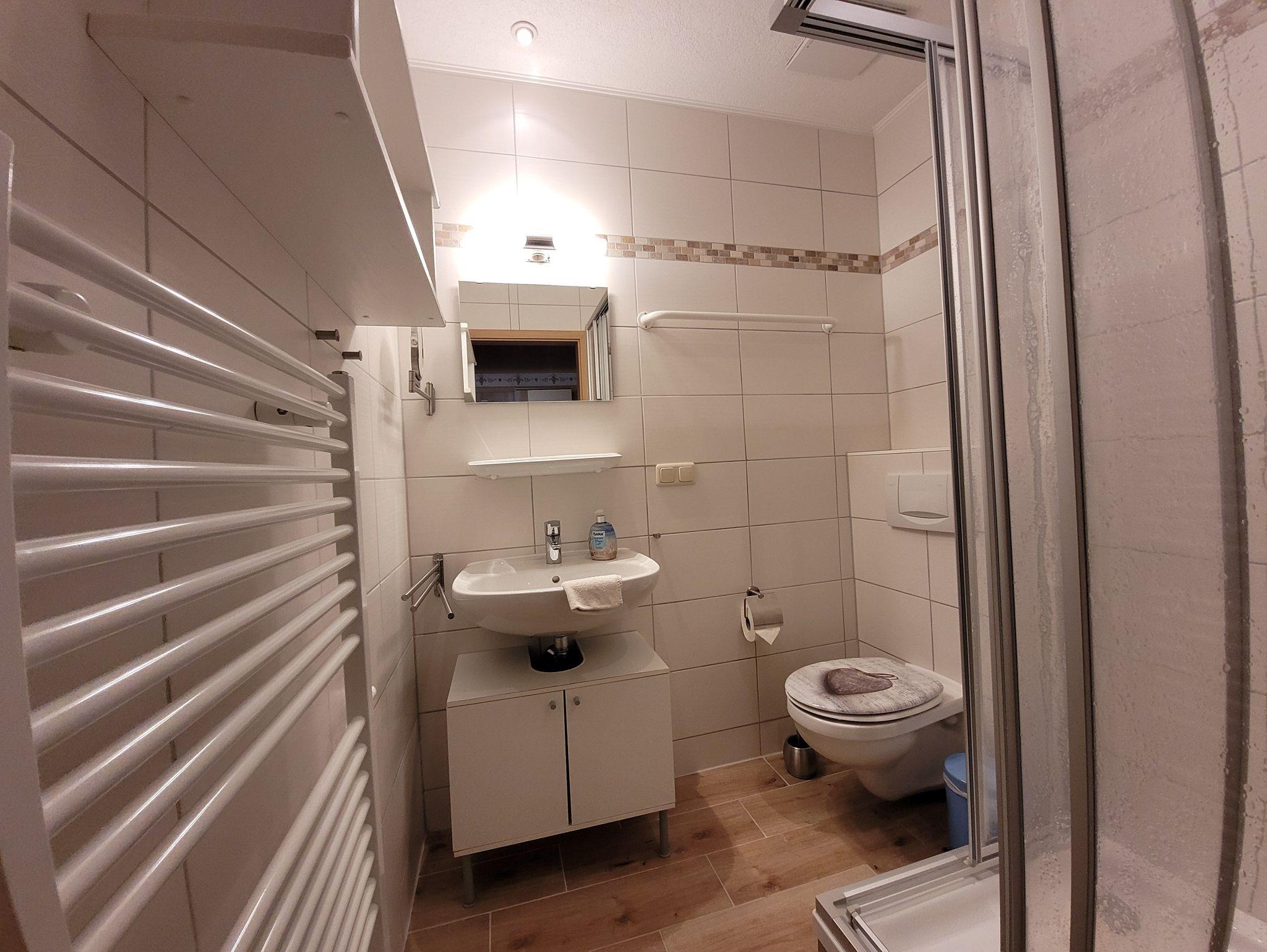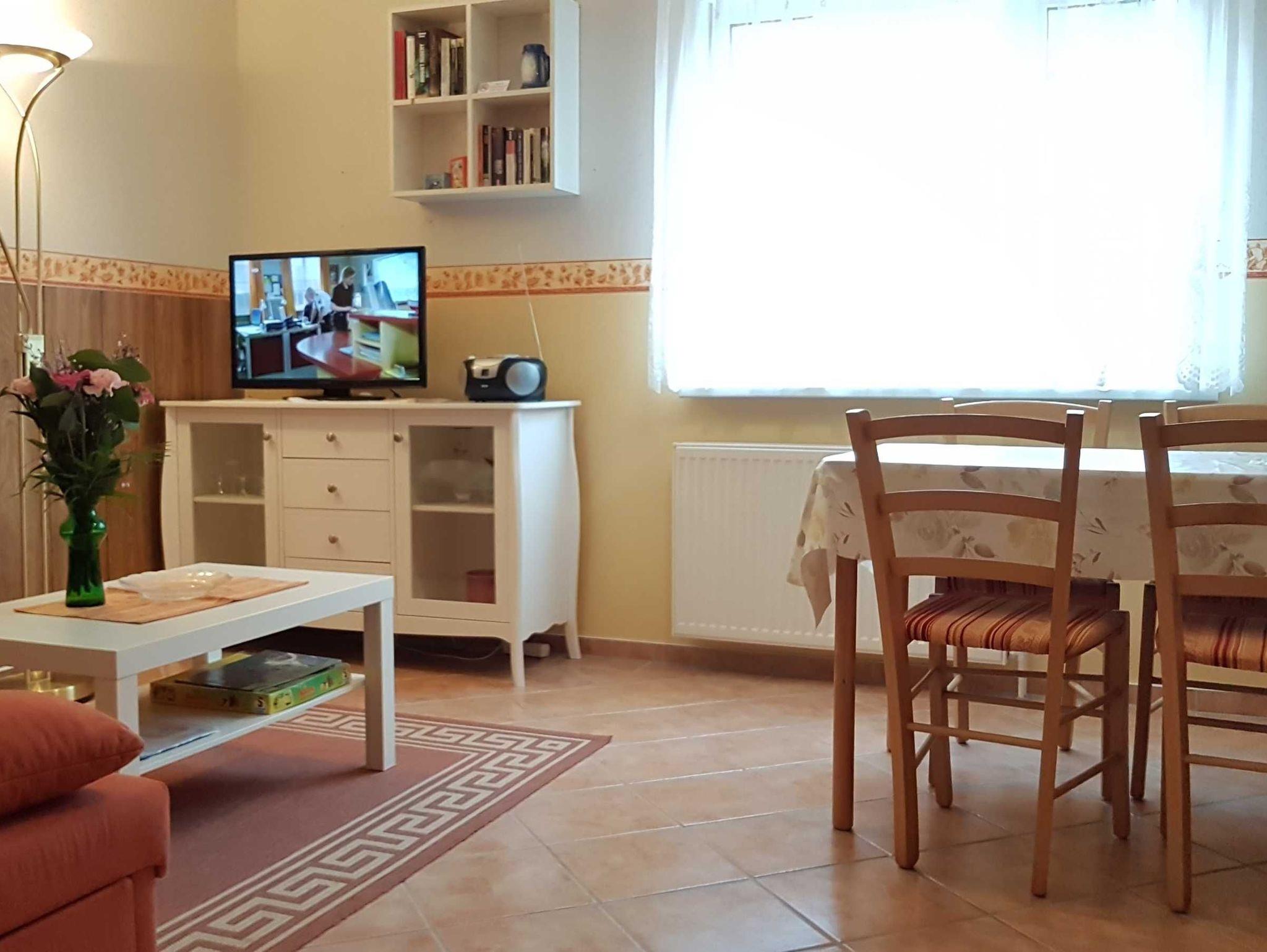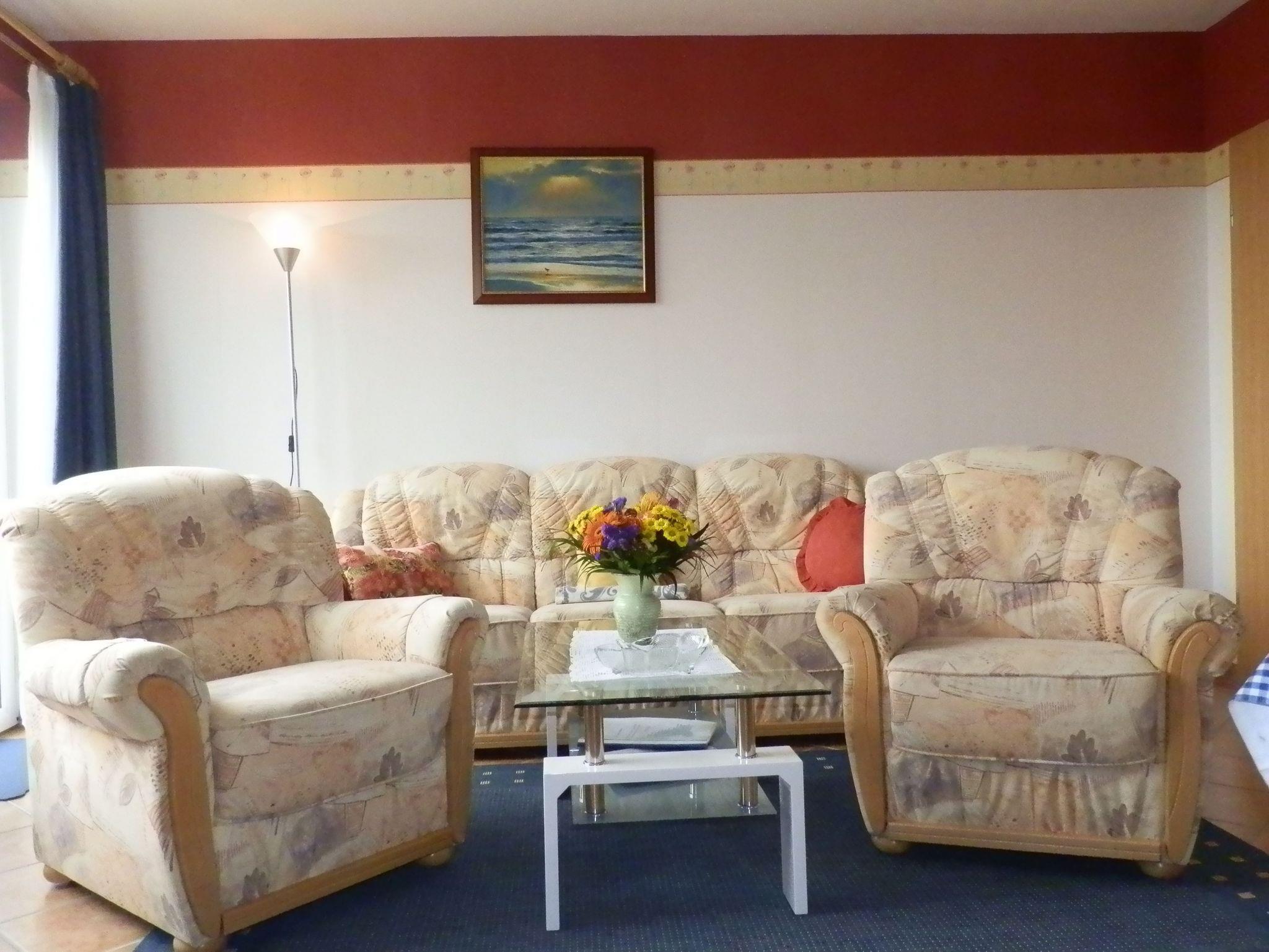 Die komplett eingerichtete Ferienwohnung mit Wohnzimmer, zwei Schlafzimmern mit einmal einem Doppelbett und einmal zwei Einzelbetten, Küchenzeile, Dusche, WC, Flur und großer Terrasse/Balkon würde für Sie bereitstehen. Zur Ausstattung gehören weiter Radio, Sat- Fernseher, einmalig Bettwäsche und Handtücher. In der Küchenzeile sind Mikrowelle, Kaffeemaschine und Toaster, Eier- und Wasserkocher sowie ein 2- Platten-Kocher, Kühlschrank und Geschirr vorhanden.