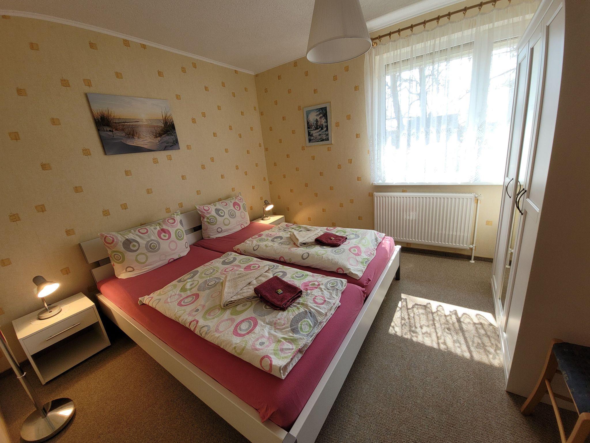 Unser Ferienhaus liegt ca.15 Geh-Minuten vom Strand entfernt in einer ruhigen Wohnlage. Die komplett eingerichtete Ferienwohnung mit Wohnzimmer, zwei Schlafzimmern mit einem Doppelbett und einmal zwei Einzelbetten, Küchenzeile, Dusche, WC, Flur und großem Balkon/Terrasse würde für Sie bereitstehen. Zur Ausstattung gehören weiter Radio, Fernseher, einmalig Bettwäsche und Handtücher. In der Küchenzeile sind Mikrowelle, Kaffeemaschine und Toaster, Eier-und Wasserkocher sowie ein 2-Platten-Kocher, Kühlschrank und Geschirr vorhanden. Eine Aufbettung ist im Wohnzimmer nach Absprache auf dem ausziehbarem Sofa möglich.