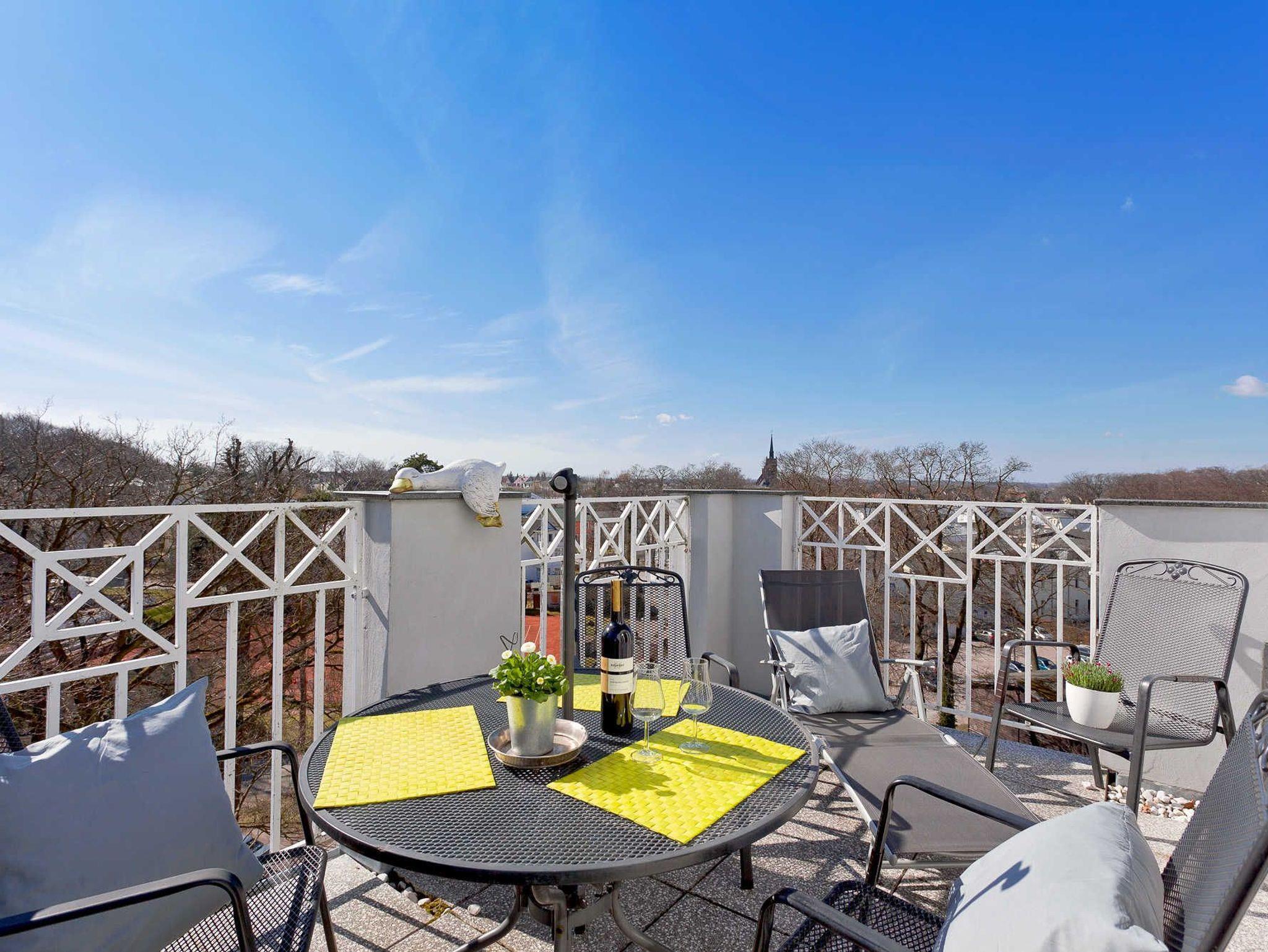 Große Dachterrasse mit Sonnenschirm und Gartenmöbeln