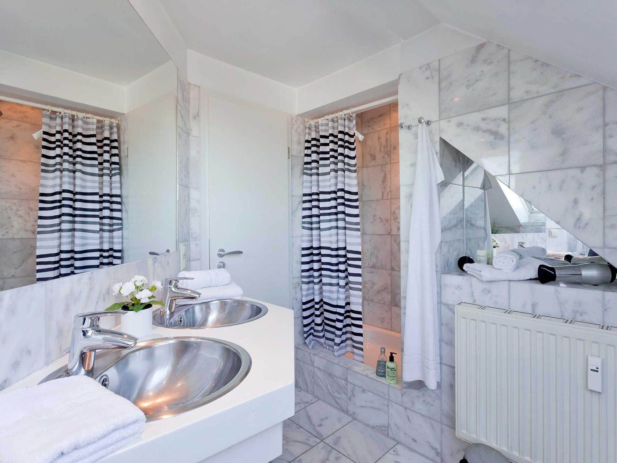 Bad in Marmor mit Dusche/Wanne, Doppelwaschtisch, WC
