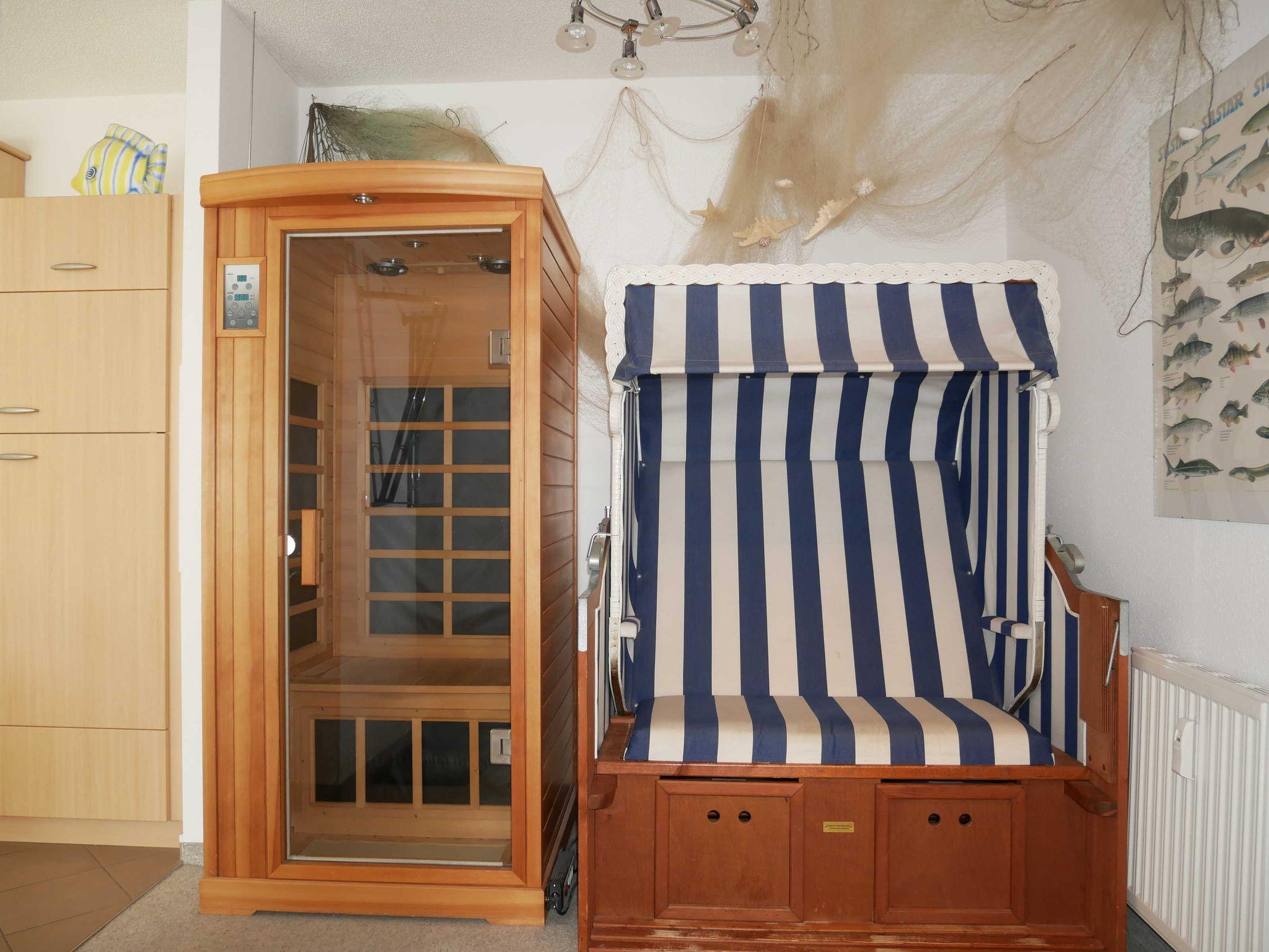 Als Highlight verfügt die Wohnung über eine Infrarot-Sauna und einen Relax-Strandkorb im Flurbereich.
