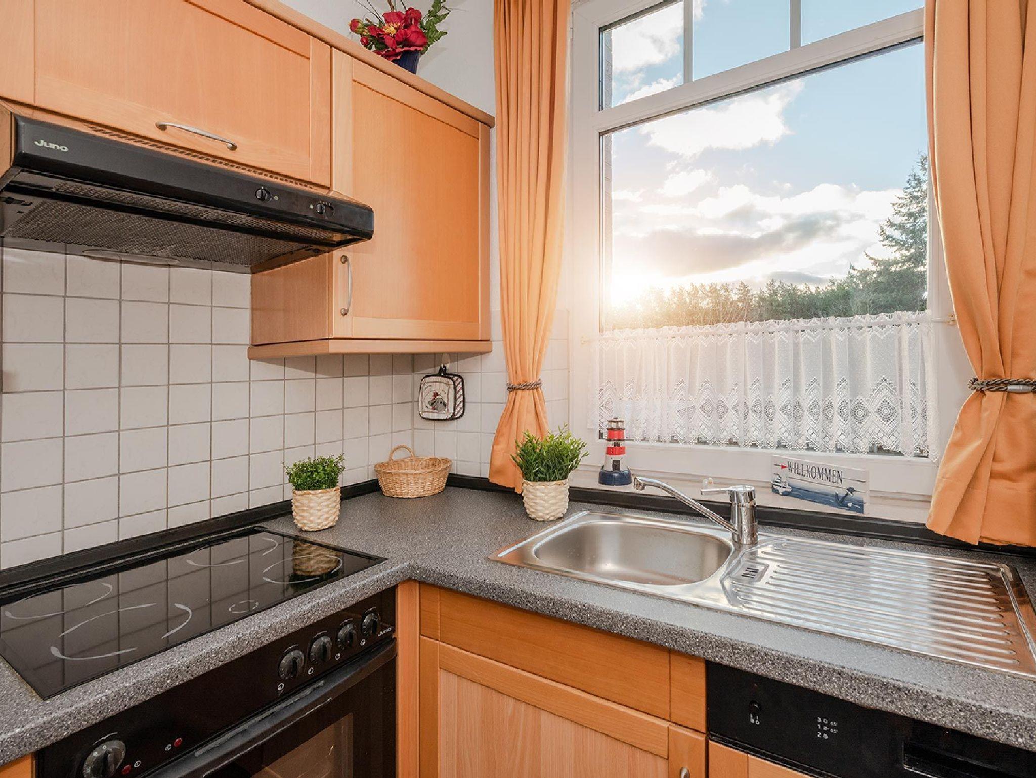 Die angrenzende Küchenzeile ist mit einem Kühlschrank mit Gefrierfach, einem Geschirrspüler und einem Backofen mit Cerankochfeld ausgestattet. Eine Kaffeemaschine, ein Toaster und ein Wasserkocher stehen Ihnen selbstverständlich zur Verfügung.