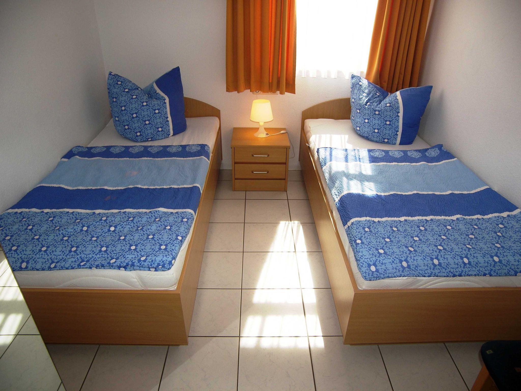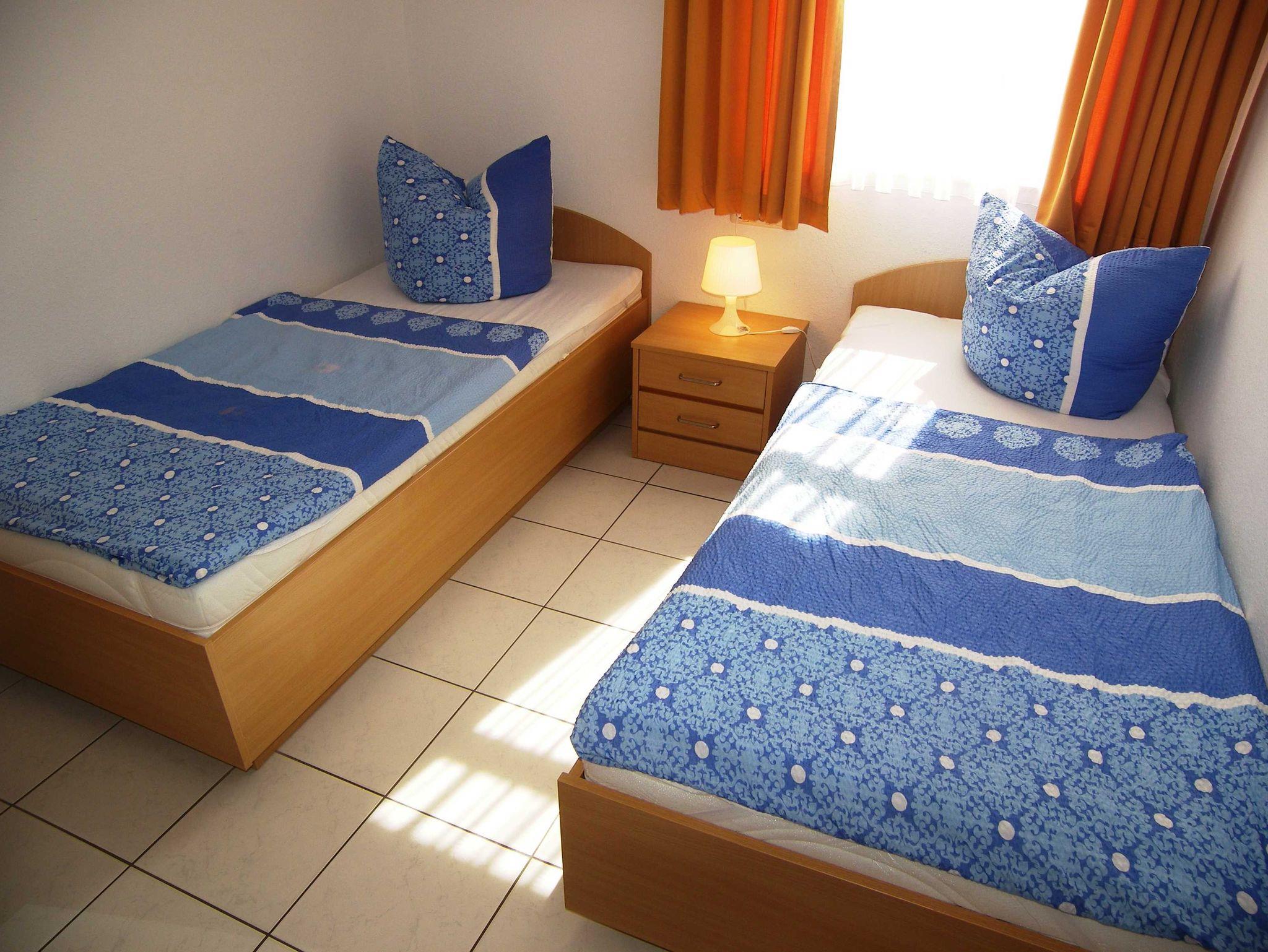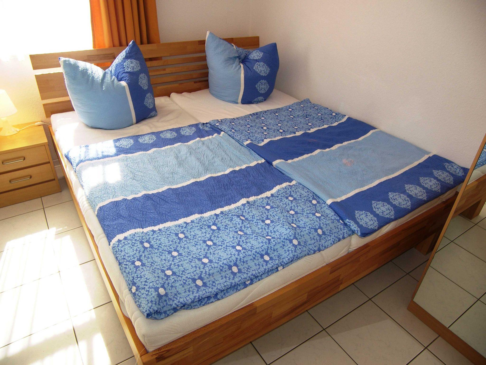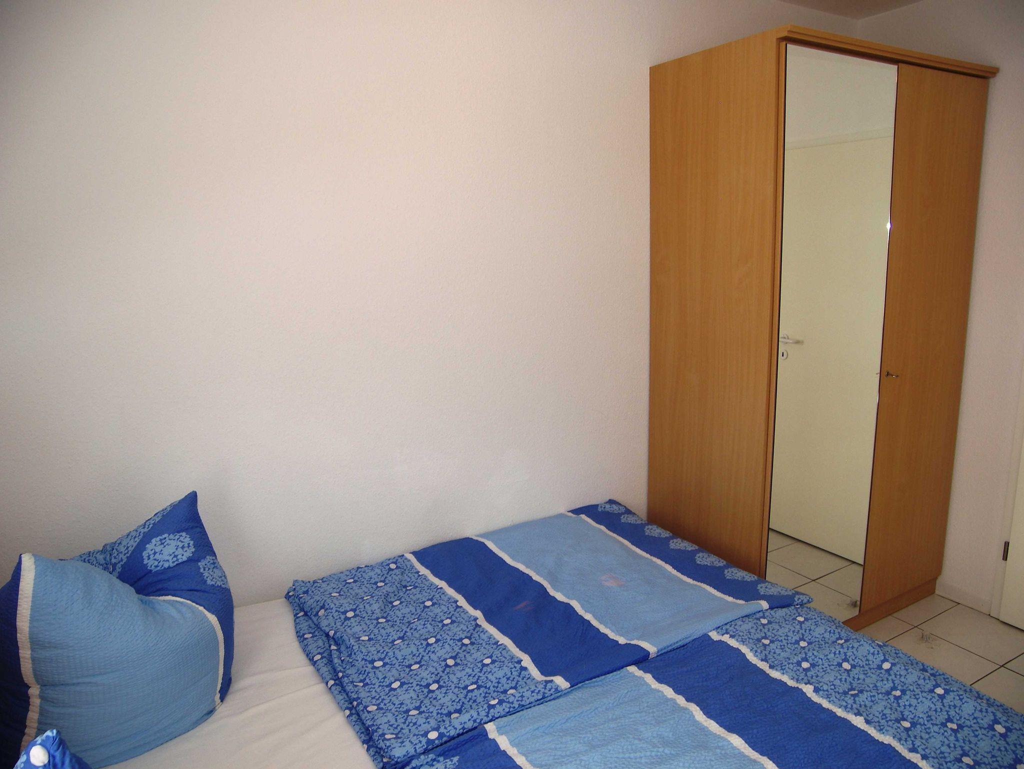 EIn Schlafzimmer ist mit einem Doppelbett und das zweite ist mit zwei Einzelbetten ausgestattet. Die Wohnung verfügt über zwei Badezimmer mit Dusche. Der zum Süden ausgerichtete möblierte Balkon lädt zum Entspannen und Erholen ein.