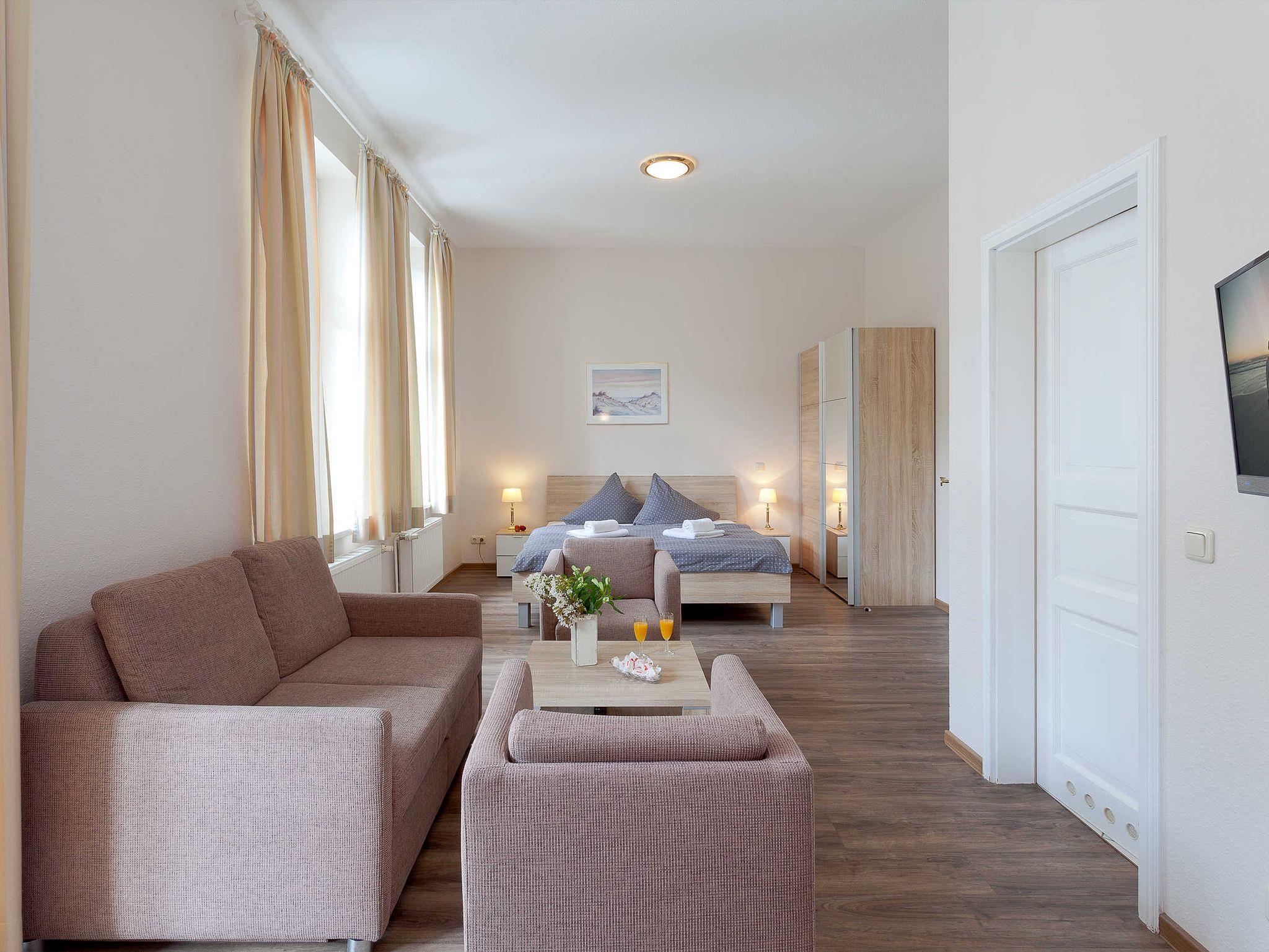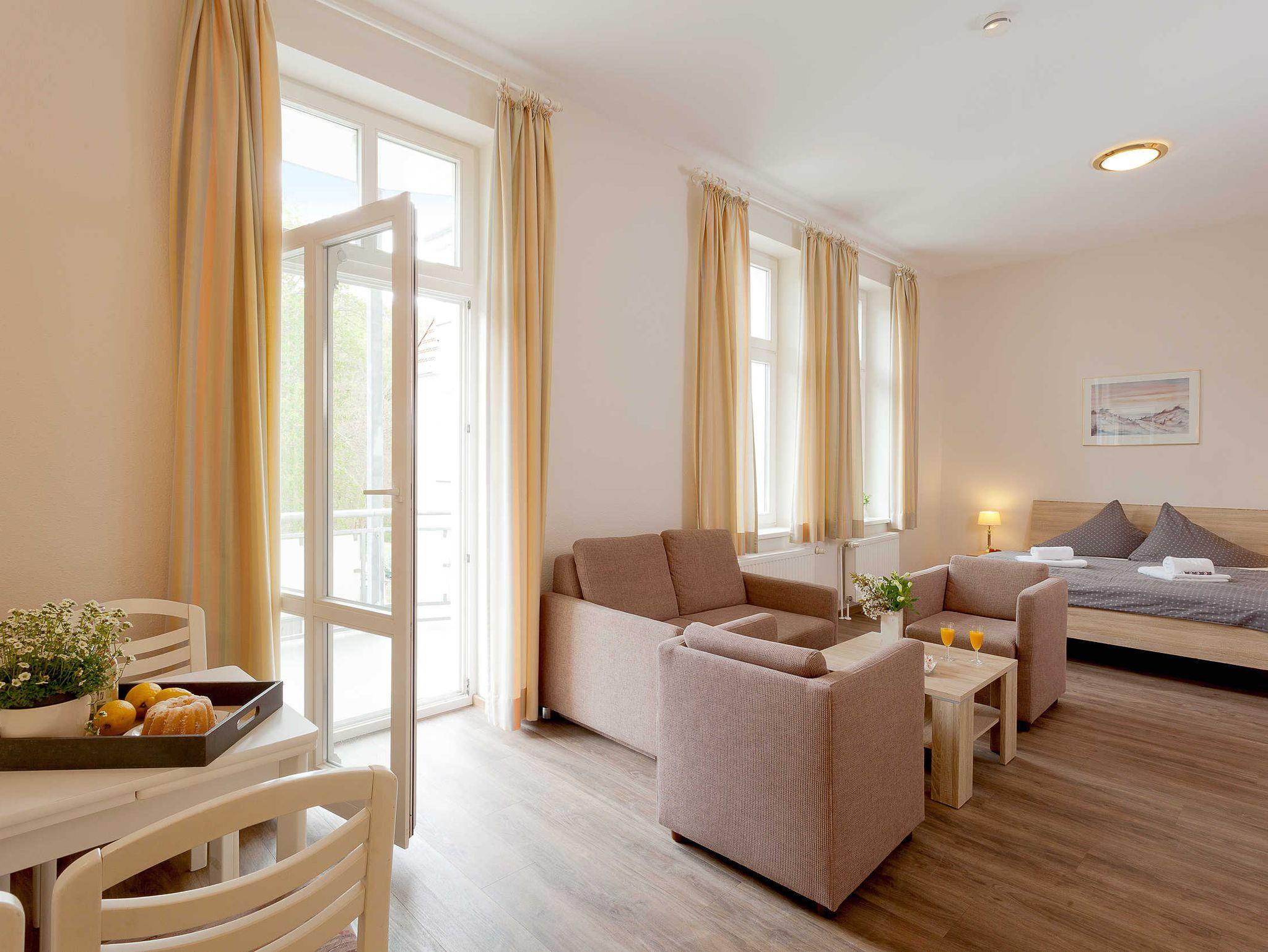 Im behaglichen Wohnraum befinden sich sowohl ein Doppelbett als auch eine Sitzgarnitur zur Entspannung. An einem Esstisch können Sie Ihre Mahlzeiten gemeinsam zu sich nehmen. Die Pantryküche besitzt eine kleine Herdplatte und einen kleinen Kühlschrank. Das Bad besitzt eine Dusche und ein WC. Auf dem Balkon können Sie den Tag gemütlich ein- und ausklingen lassen. Einen PKW-Stellplatz stellen wir Ihnen selbstverständlich zur Verfügung.