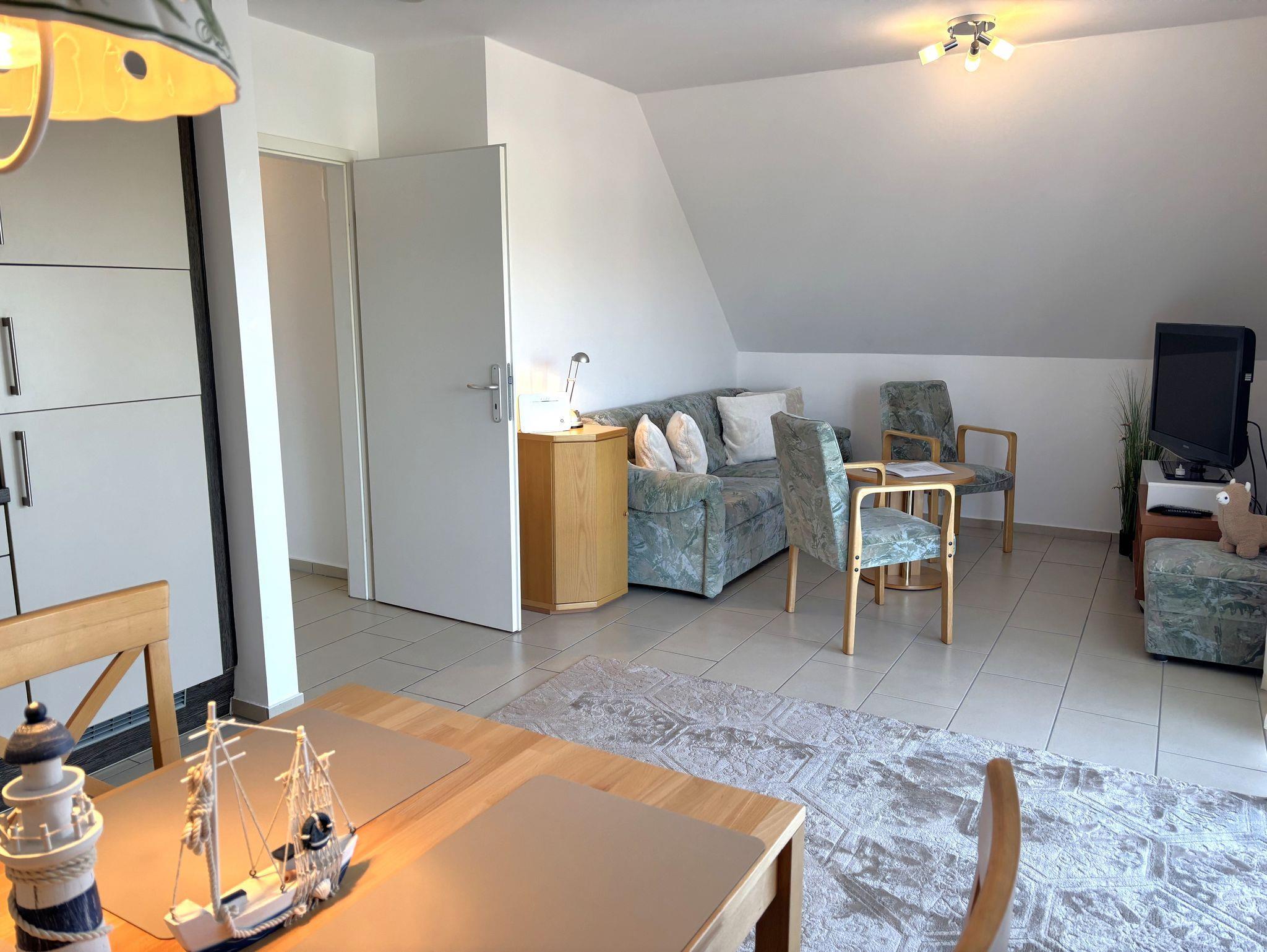 Die gemütliche 2-Raum-Ferienwohnung mit Balkon und ist 52qm groß. Der großzügige Wohnbereich erwartet Sie mit einem Esstisch, Flat-TV sowie einem großen Sofa (Aufbettungsmöglichkeit für 2 Personen/Liegefläche 1,80x2,00m), welches durch extra Matratzenauflage besonderen Schlafkomfort bietet.