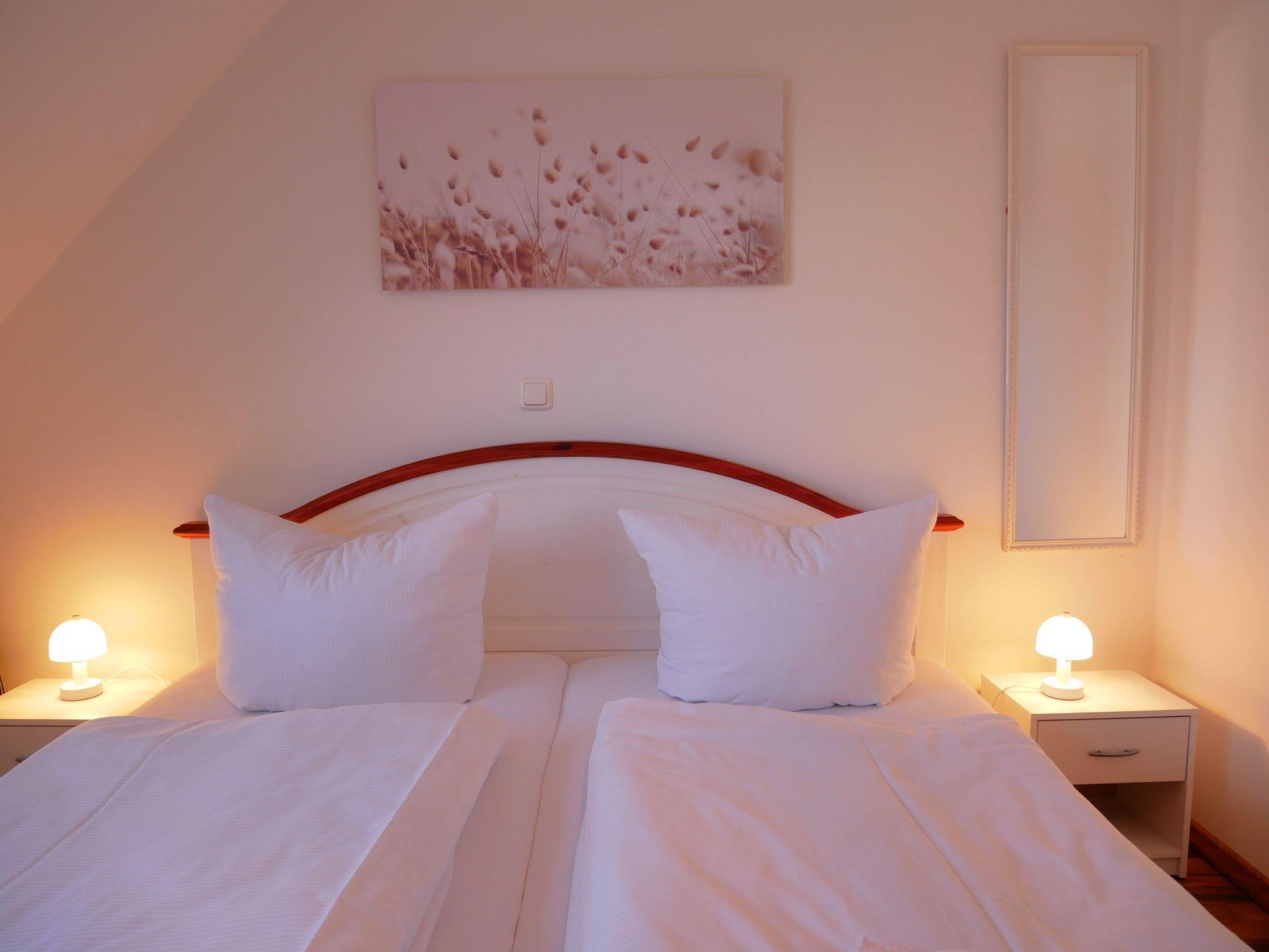 Das separate Schlafzimmer verfügt über ein Doppelbett (1,80x2,00m), mit neuen Matratzen (Härtegrad 3), einen Kleiderschrank für Ihre Urlaubsgarderobe und einen zweiten SAT-TV mit DVD-Player.