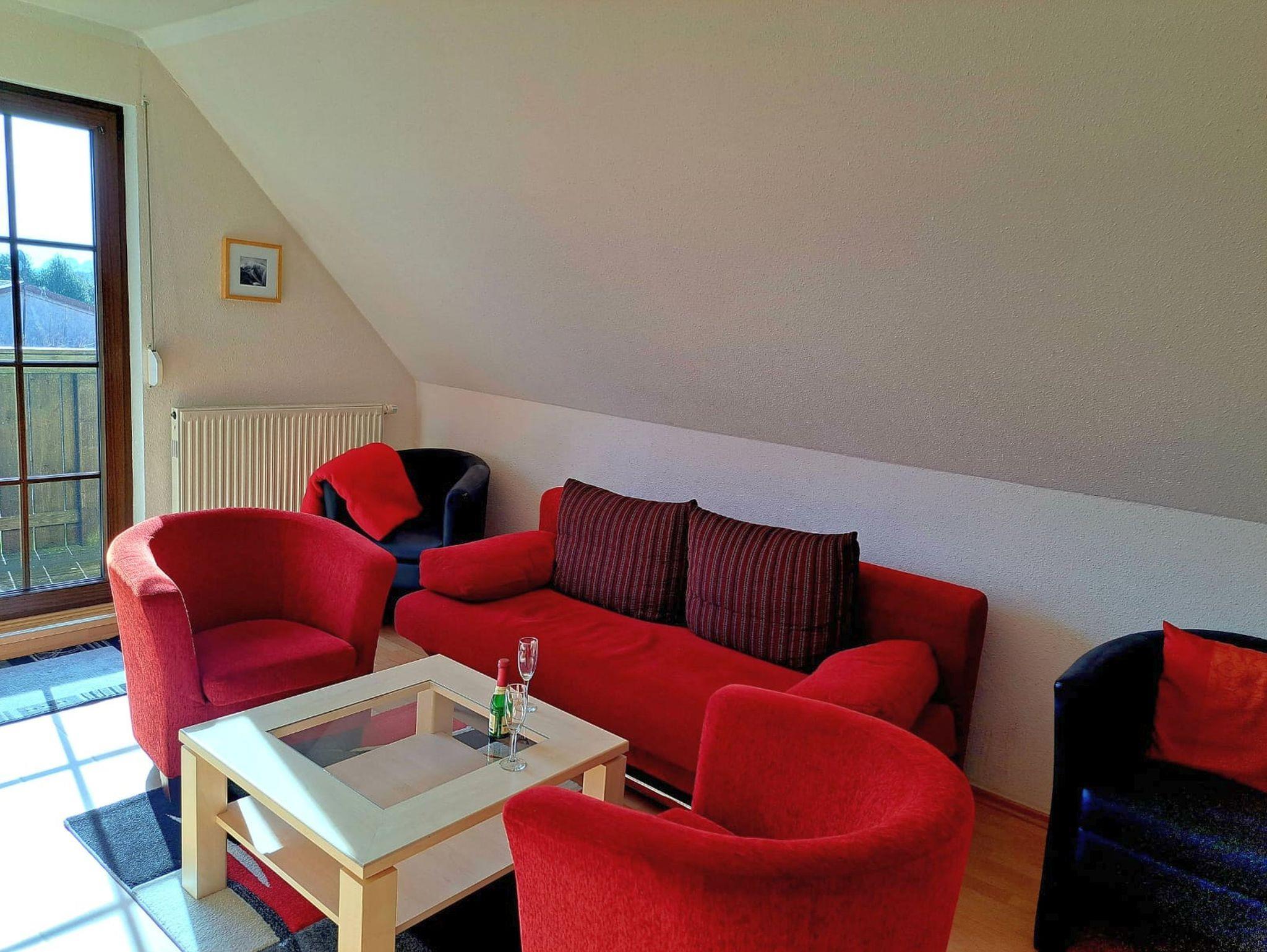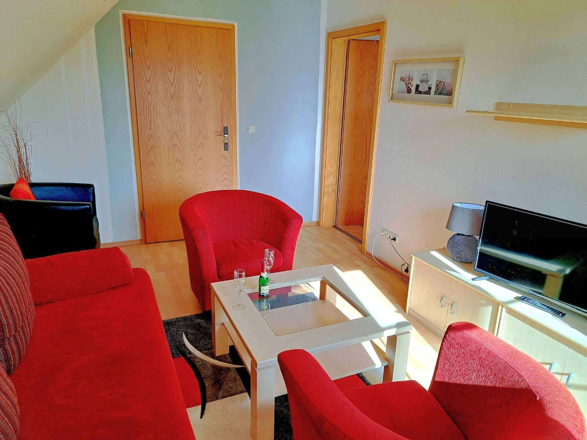 Über die Treppe gelangen Sie ins Obergeschoss (mit charmanten Dachschrägen), wo eine weitere Diele auf Sie wartet. Hier erwartet Sie ein gemütlicher Wohnraum mit Sitzgruppe und Zugang zum Balkon ? der perfekte Ort, um den Tag bei einem Glas Wein ausklingen zu lassen.